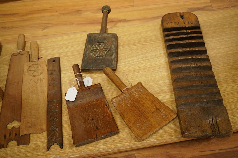 Lot 445 , Sixteen Danish decoratively chip carved and painted washing bats, mangle boards, 18th/19th century, one carved and dated 1785- 63cm long.