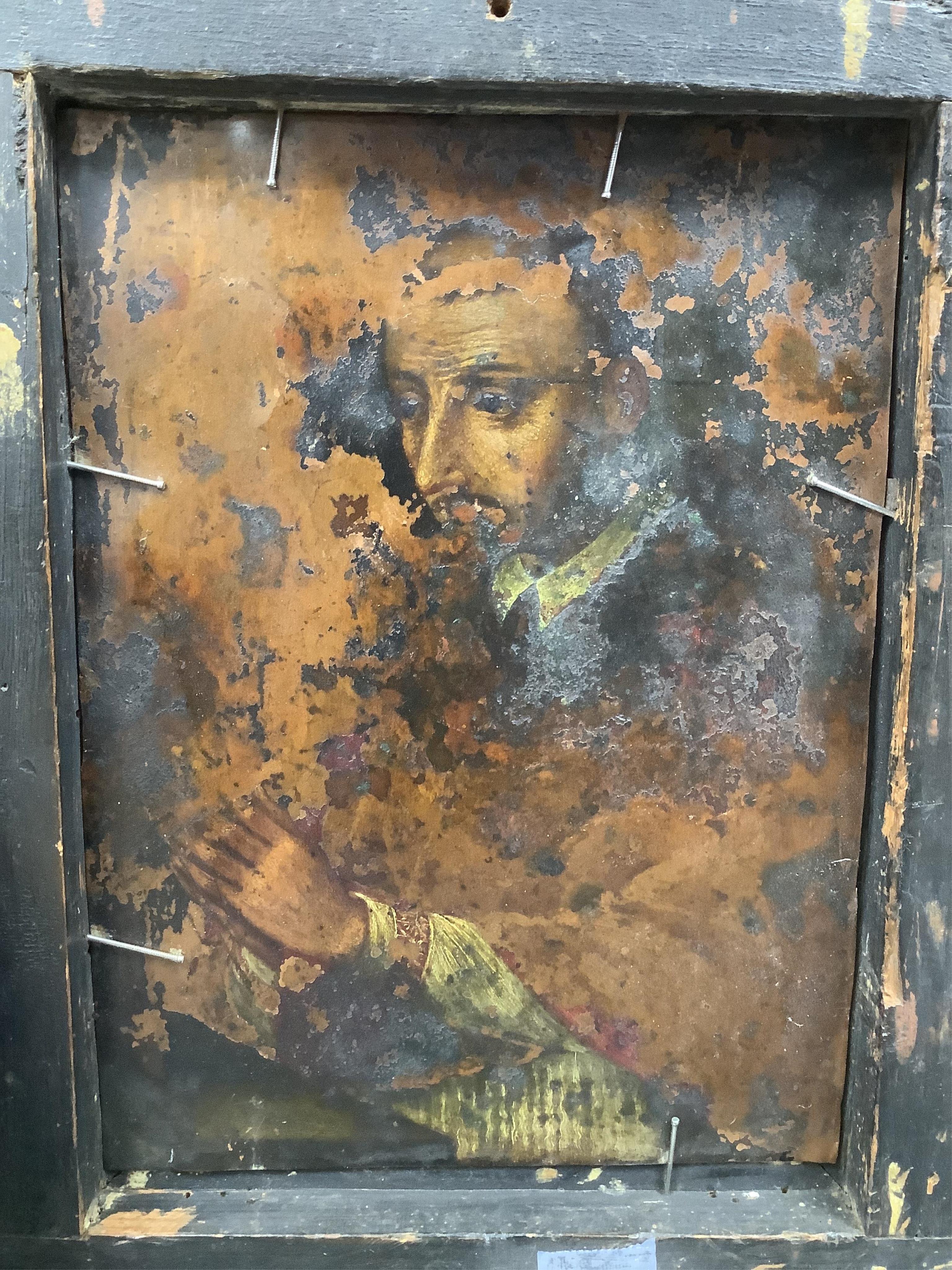 19th century, Continental School, ‘Our Lady of Sorrows’, oil on copper, partial portrait of a gentleman verso, 21 x 15cm