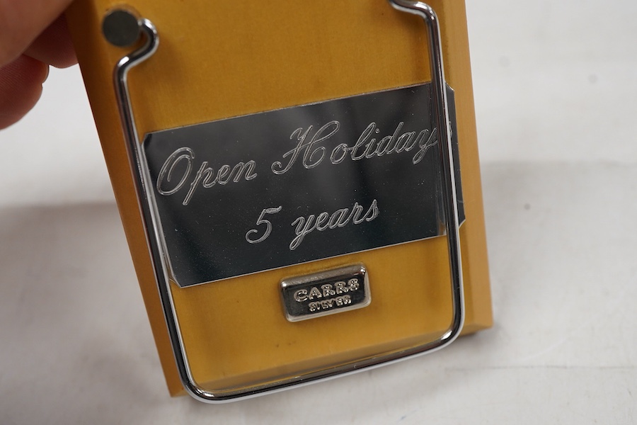 Lot 1835 , A modern Carrs silver cased desk clock, London, 2005, a Victorian silver 1894 crown and a silver and mother of pearl folding fruit knife.