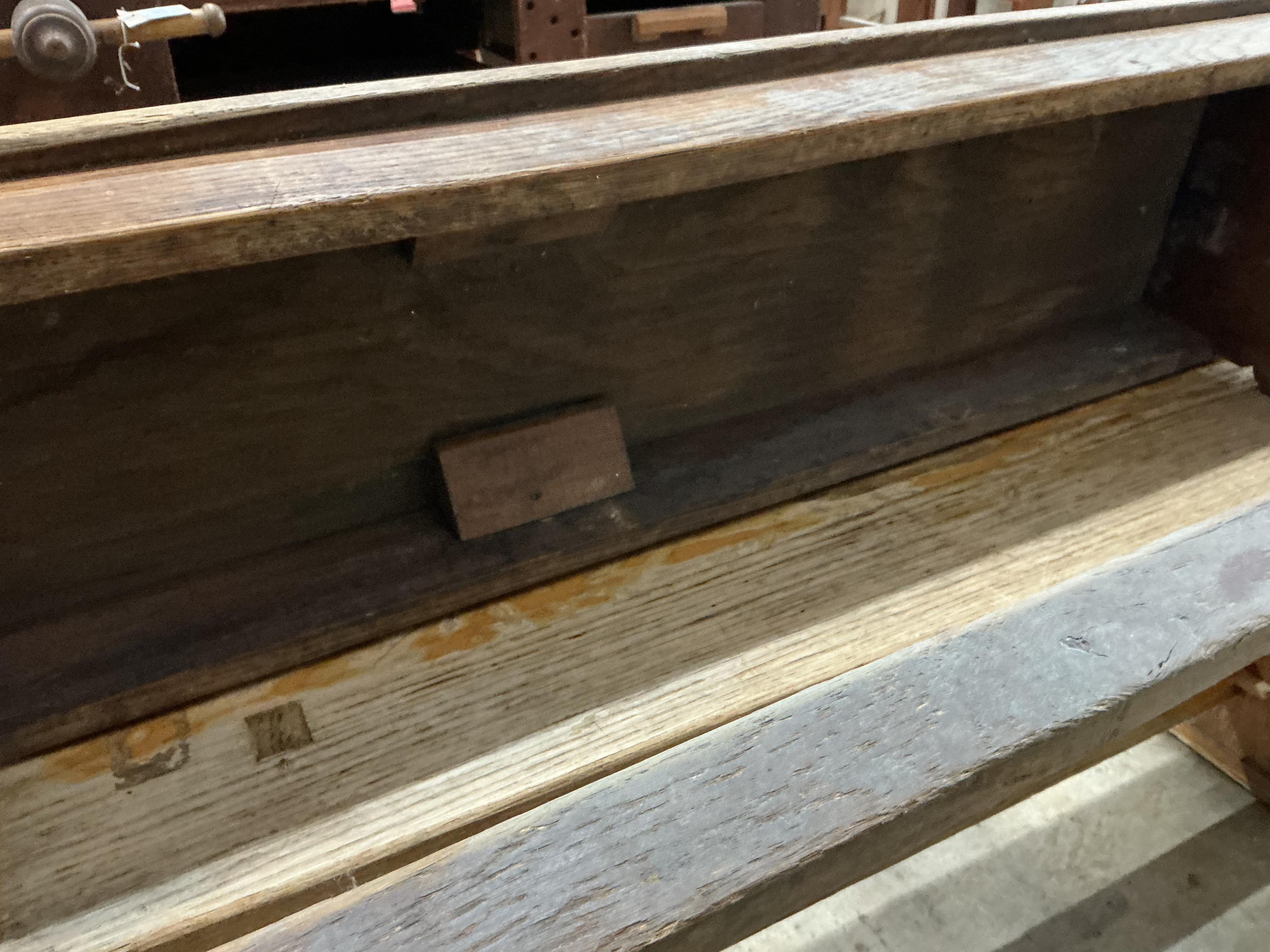 Heavily worn with splits and chips consistent with age and usage. No signs of woodworm or repairs- very sturdy. Extra images added on the Gorringes website.
