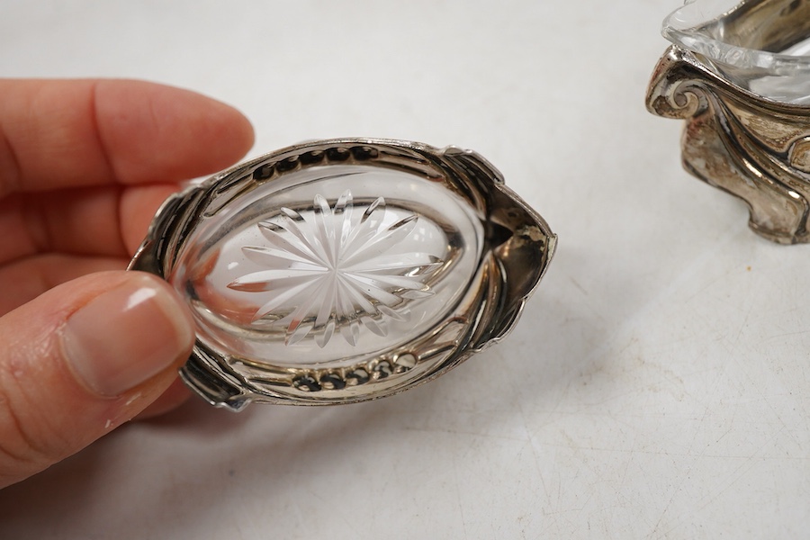 Three assorted silver mounted hand mirrors, including engine turned by Goldsmiths & Silversmiths Co Ltd, London, 1927, 26.7cm, together with a pair of German 800 standard white metal salts, with clear glass liners.