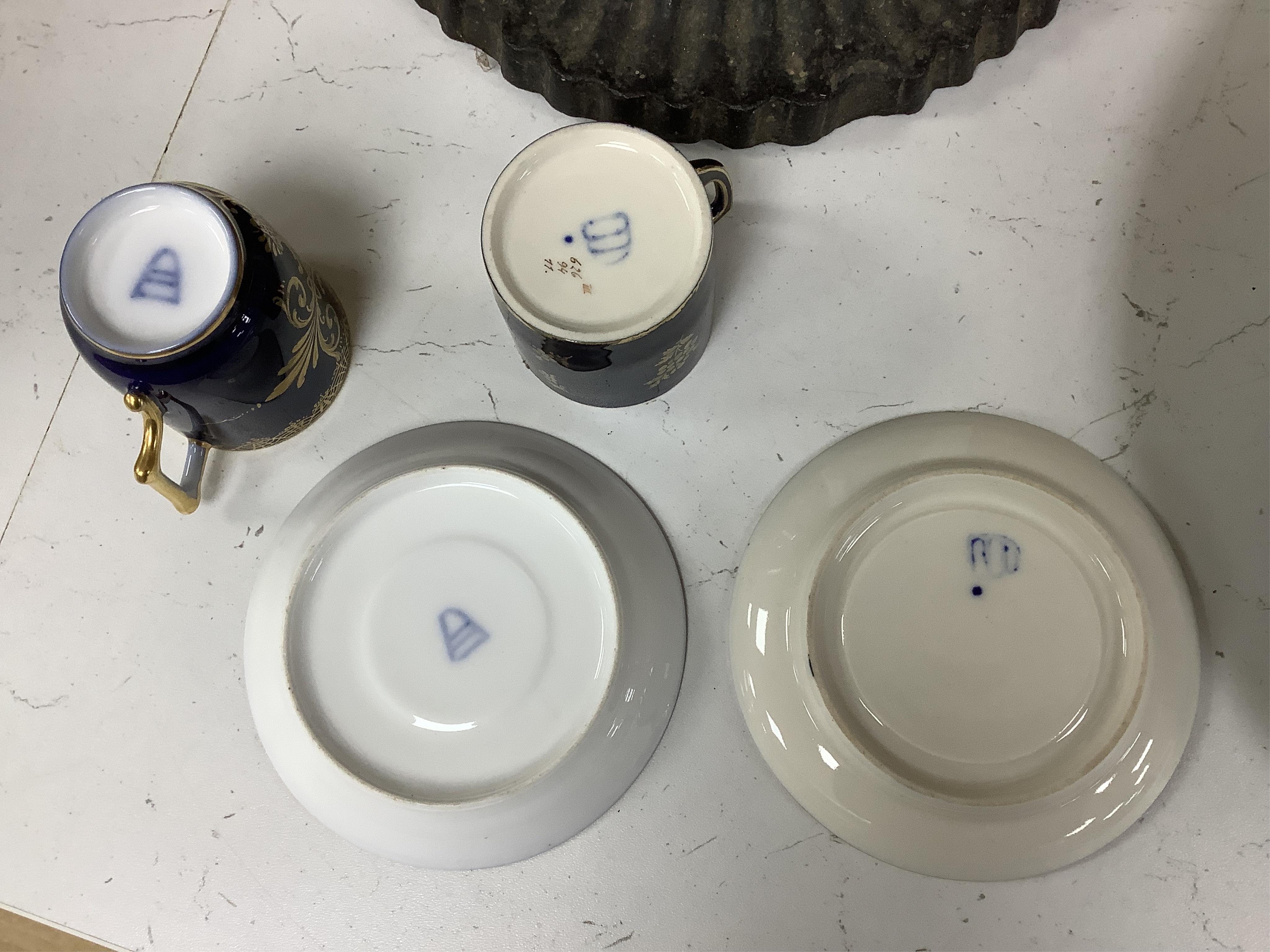 Claret-ground cup handle poorly re-built; one larger blue-ground saucer gilding worn; larger coffee cups with beehive marks.