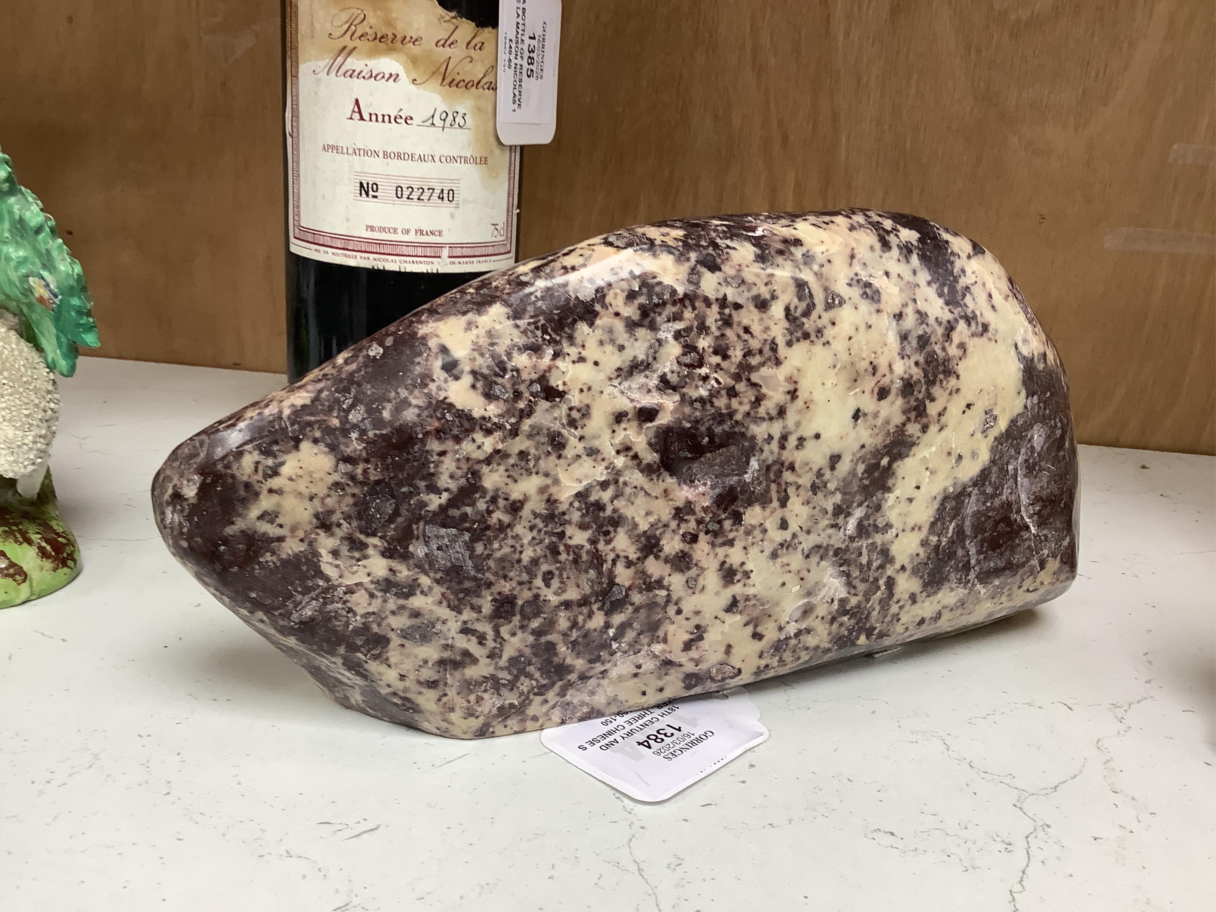 Lot 1384 , 18th century and later. Three Chinese soapstone carvings, largest 12cm high & 25cm wide.