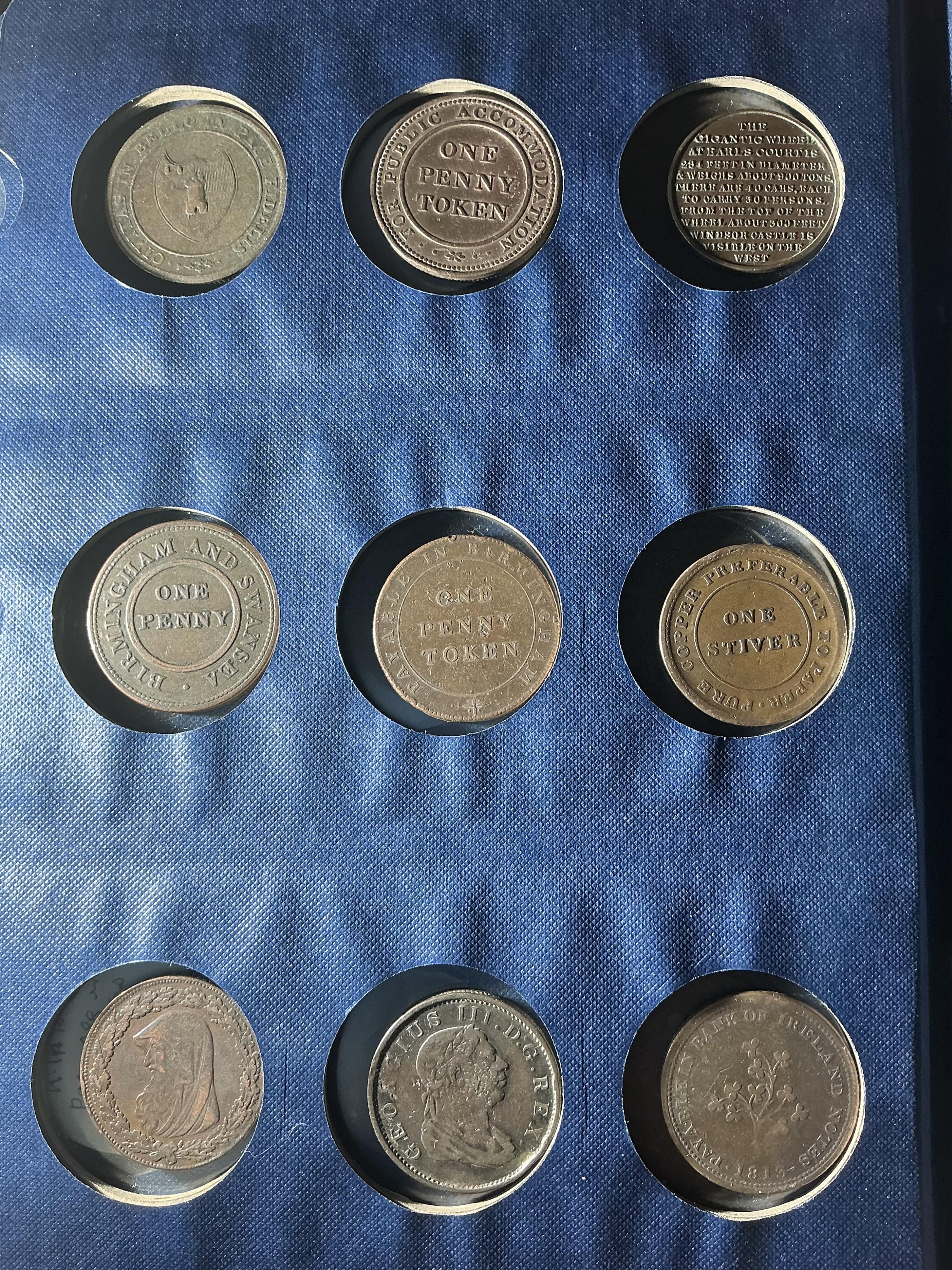 Lot 2151 , British copper one penny tokens, 18th/19th century, a collection of 36, including Cheltenham, Bristol and South Wales, Dudley & Birmingham, Staffordshire, Hull Ironworks, Phoenix ironworks Glasgow, Worcester, Dublin, tog