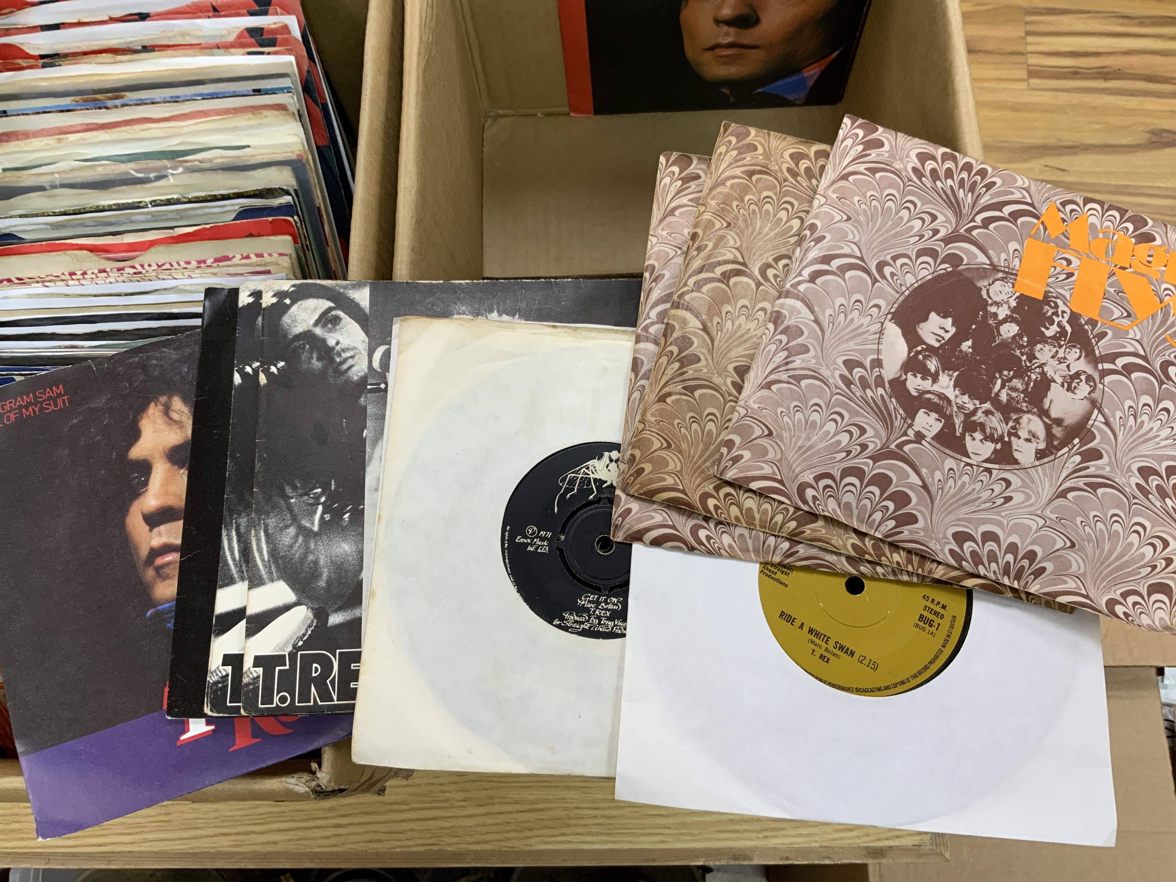Two boxes of 7 inch singles, including a good selection of demo pressings with printed labels, artist include; Jeff Beck, Small Faces, The Beatles, The Beach Boys, Deep Purple, The Doors, Elton John, The Kinks, the Mamas and the Papas, David Bowie, Queen, The Who, Uriah Heep, T-Rex, Nat King Cole, the Everly Brothers, Ella Fitzgerald, Buddy Holly, The Crickets, The Rolling Stones, etc.