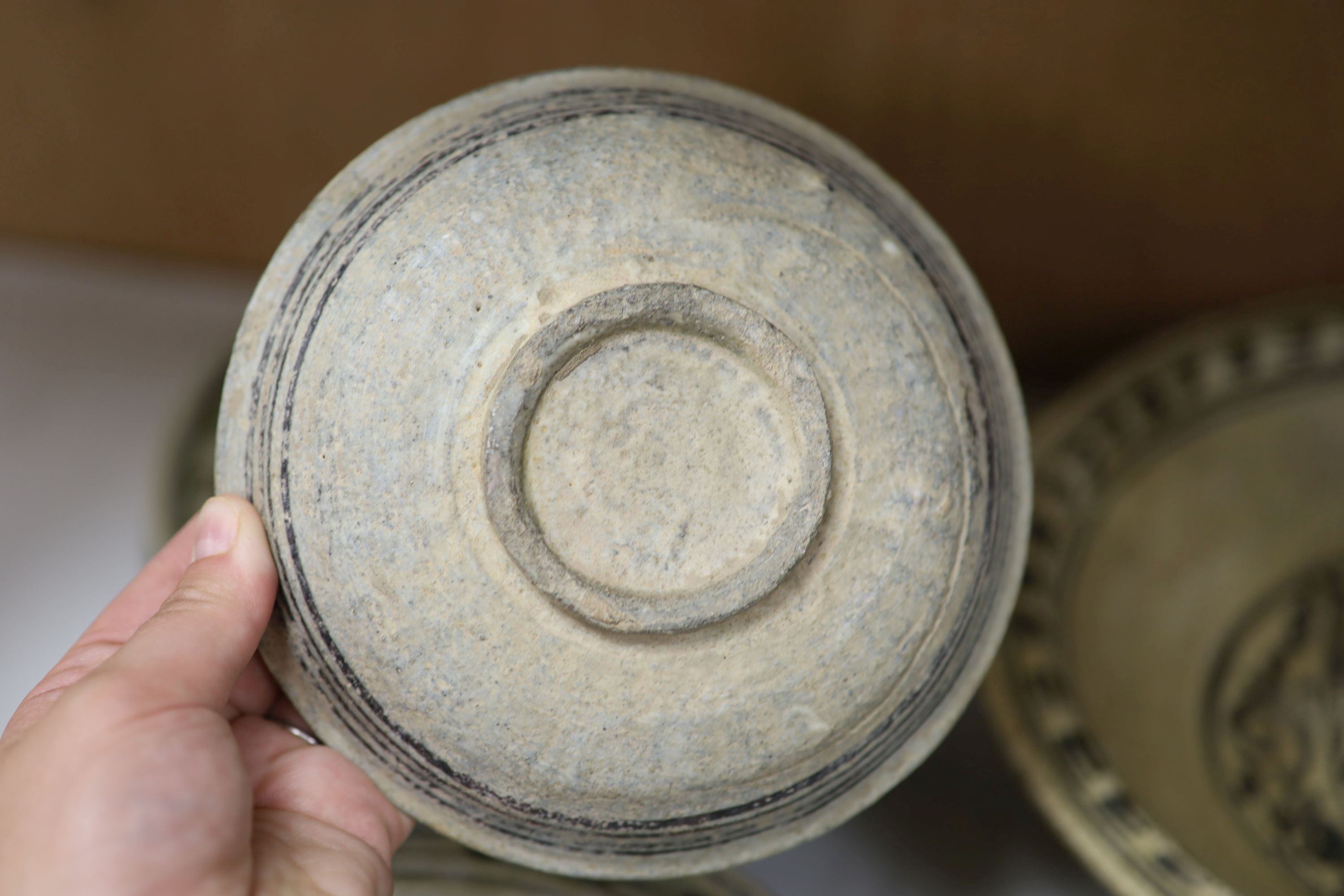 A group of Sukhothai style pottery dishes, largest diameter 29cm (7)