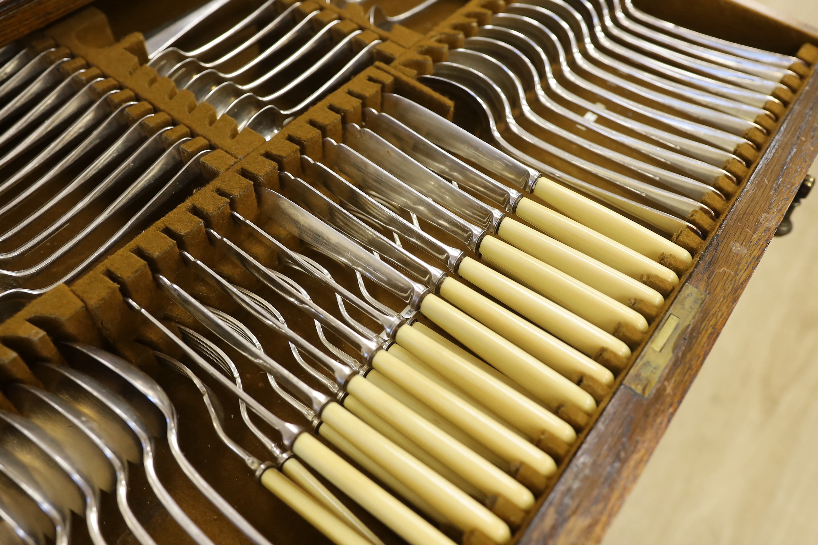 An oak standing canteen with two drawers of Mappin and Webb silver plated cutlery, settings for twelve people, 78cm high x 70cm wide x 54cm deep