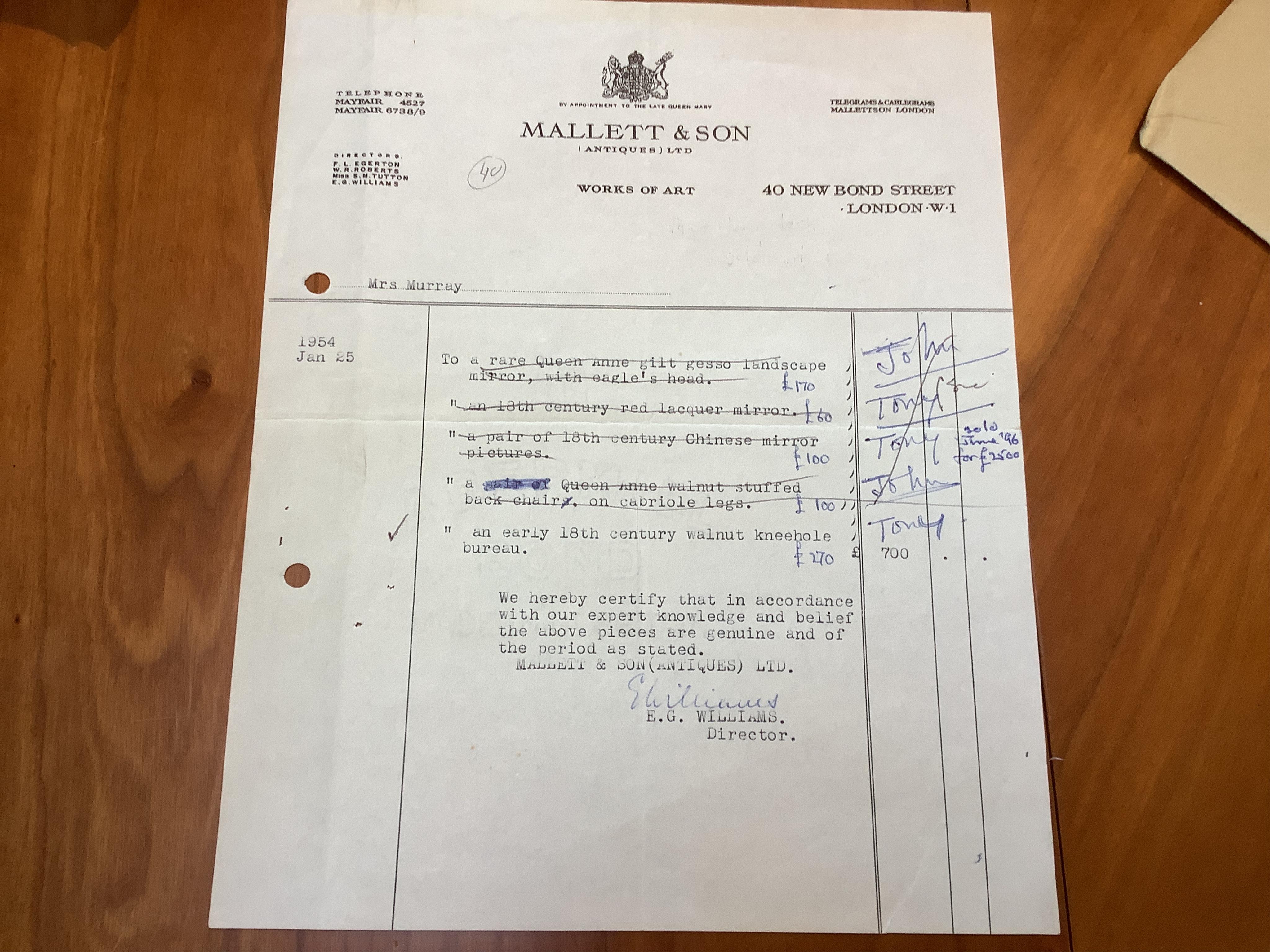 Lot 103 , A rare William III walnut and featherbanded kneehole bureau, c.1700, with kneehole underframe, width 91cm, depth 55cm, height 88cm. Purchased from Mallett & Son of New Bond Street, 25th January 1954 for £270. Condition -