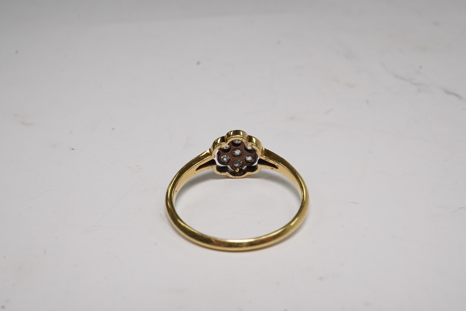 A 1940's 18ct, plat and diamond set flower head cluster ring, size O, gross weight 2.1 grams.