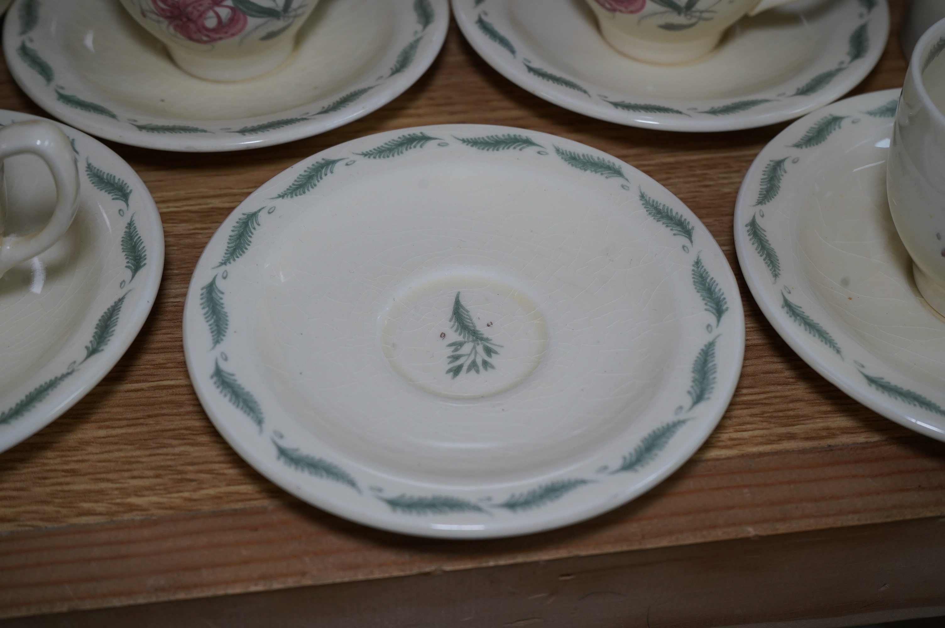 Lot 341 , A Susie Cooper style 'Tiger Lily' pattern teaset, possibly by Wood & Co., a Susie Cooper reference book and a later painted Falcon shape coffee pot. Condition - good