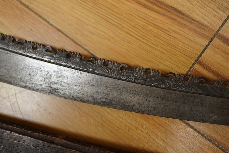 An elaborate Dayak headhunter’s sword Mandau, curved blade with chiselled and engraved back edge, large bone grip carved with protruding teeth, etc. in its wooden scabbard. Condition - good, some age wear. * Due to new safety regulations and legal restrictions with ParcelForce and Royal Mail, we are unable to pack and/or send swords, bladed items and weaponary through postal service.
