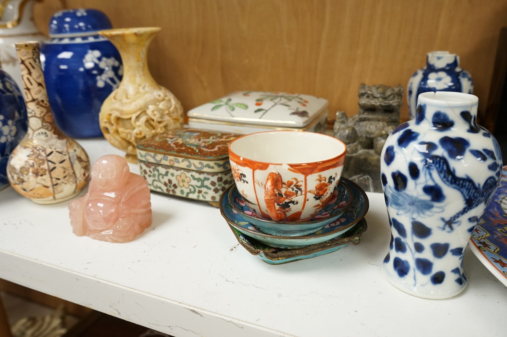 Lot 1385 , A group of mixed Chinese and Japanese ceramics to include soapstone carvings, prunus flower ginger jars, rose quartz Buddha and pair of famille rose bowls. Condition - varies, mostly fair/good