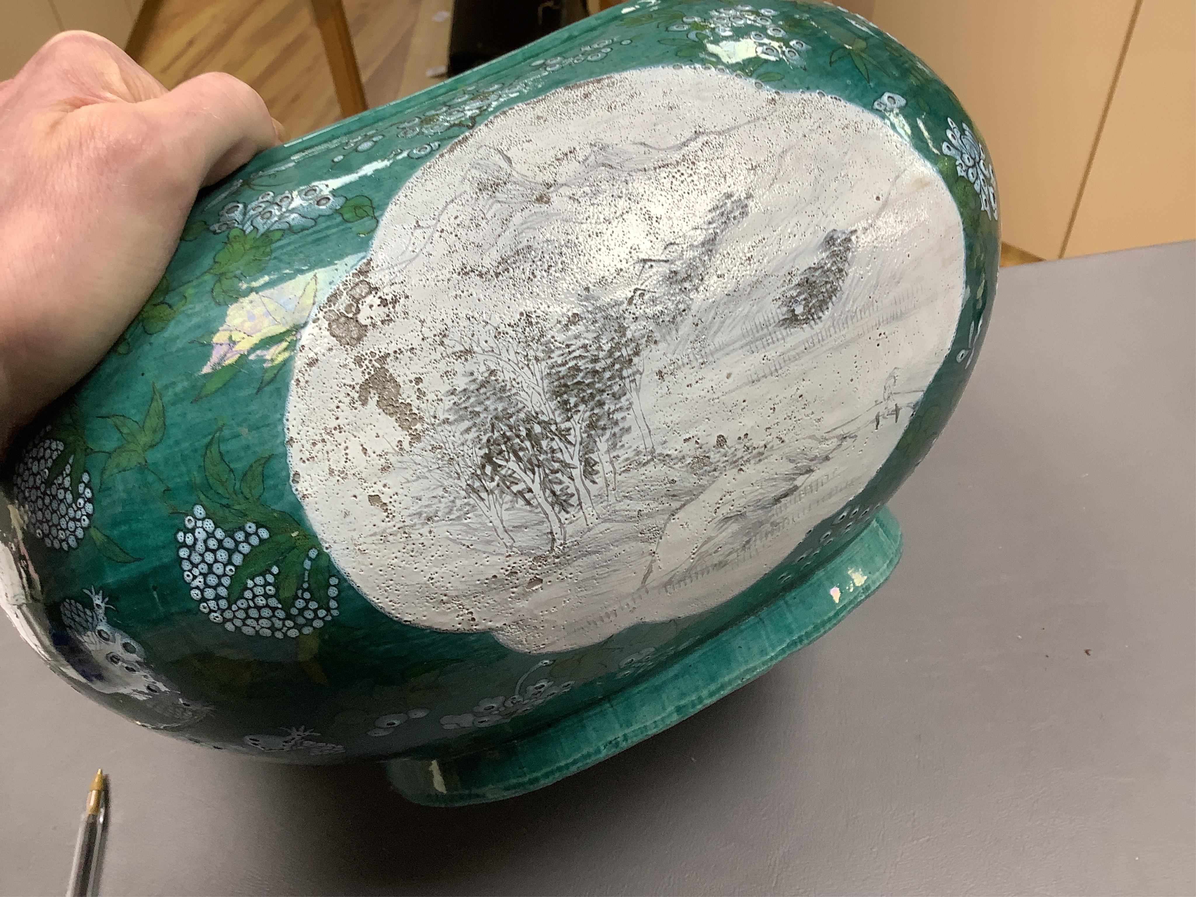 Structurally good; seems to have been constructed in two sections with a clear seam; rubs at circumference, see images 7 and 8; later metal rack inserted to interior, presumably for the display of flowers, the underside of which is plugged, a factory feature.
