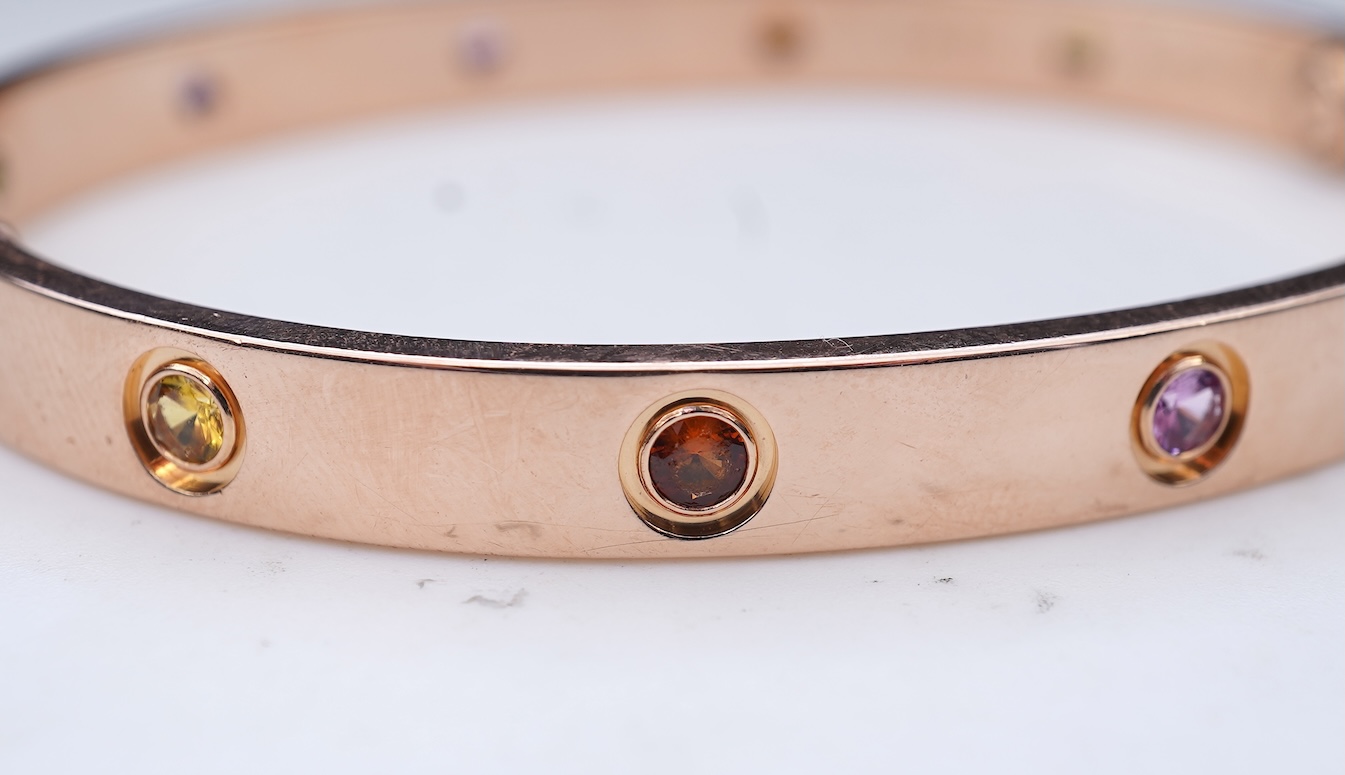 Cartier, a multi-gem 'LOVE' bangle, of manacle design, fastened by screws, set with a sequence of various brilliant-cut gemstones including pink and yellow sapphires, tsavorite and hessonite garnets and amethyst, mounted in 18ct rose gold, size 18, inner circumference approximately 16.8cm, signed Cartier, numbered CXL512, Swiss assay marks, Cartier maker's mark, gross weight approximately 31 grams, fitted case and pouch stamped Cartier, Cartier certificate of authenticity, screwdriver deficient