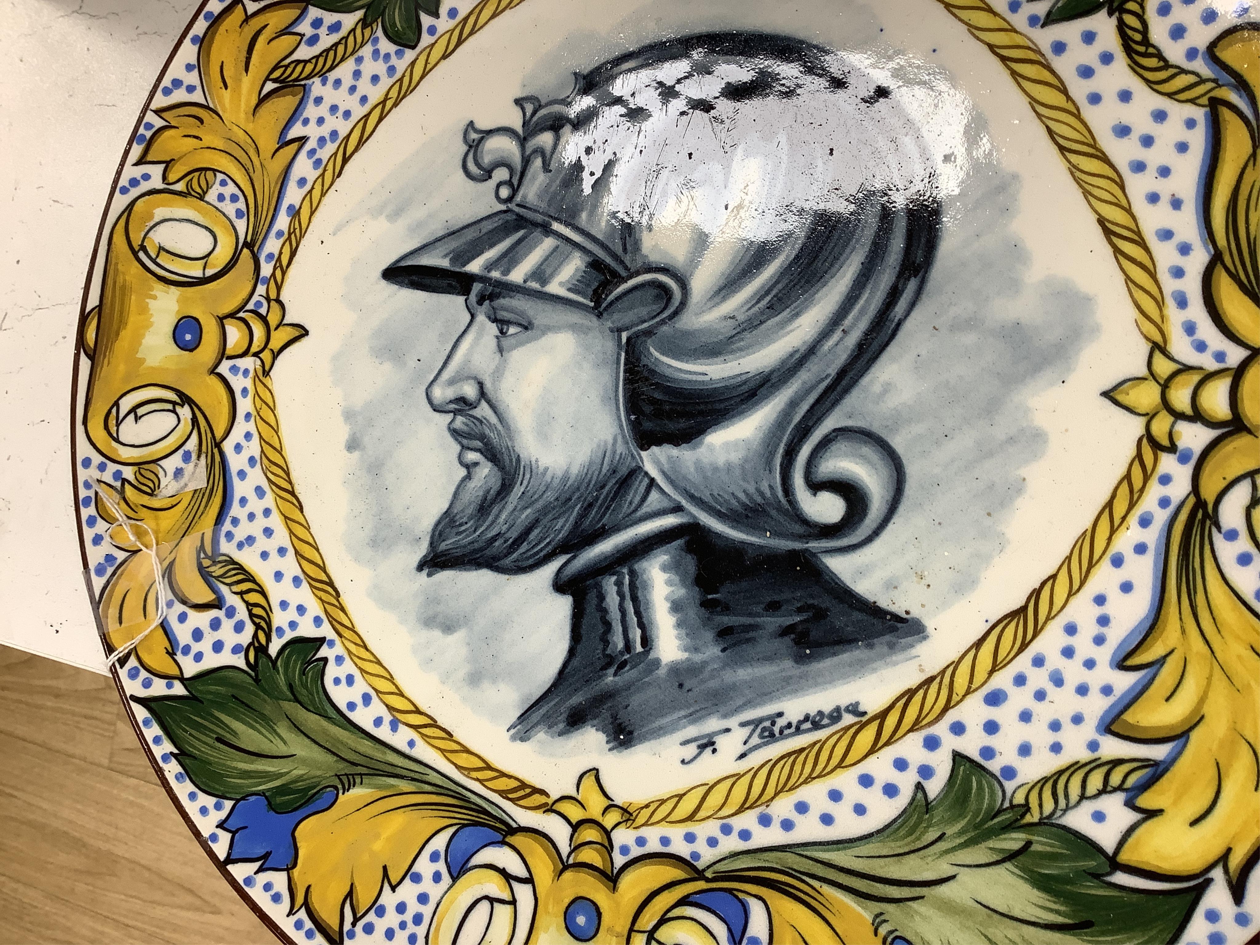 Argenta good; pattern 941. Majolica charger two flakes of brown enamel at rim, possibly a manufacturing imperfection; some surface scratches; made for hanging. Crackle bowl good; also made for hanging.
