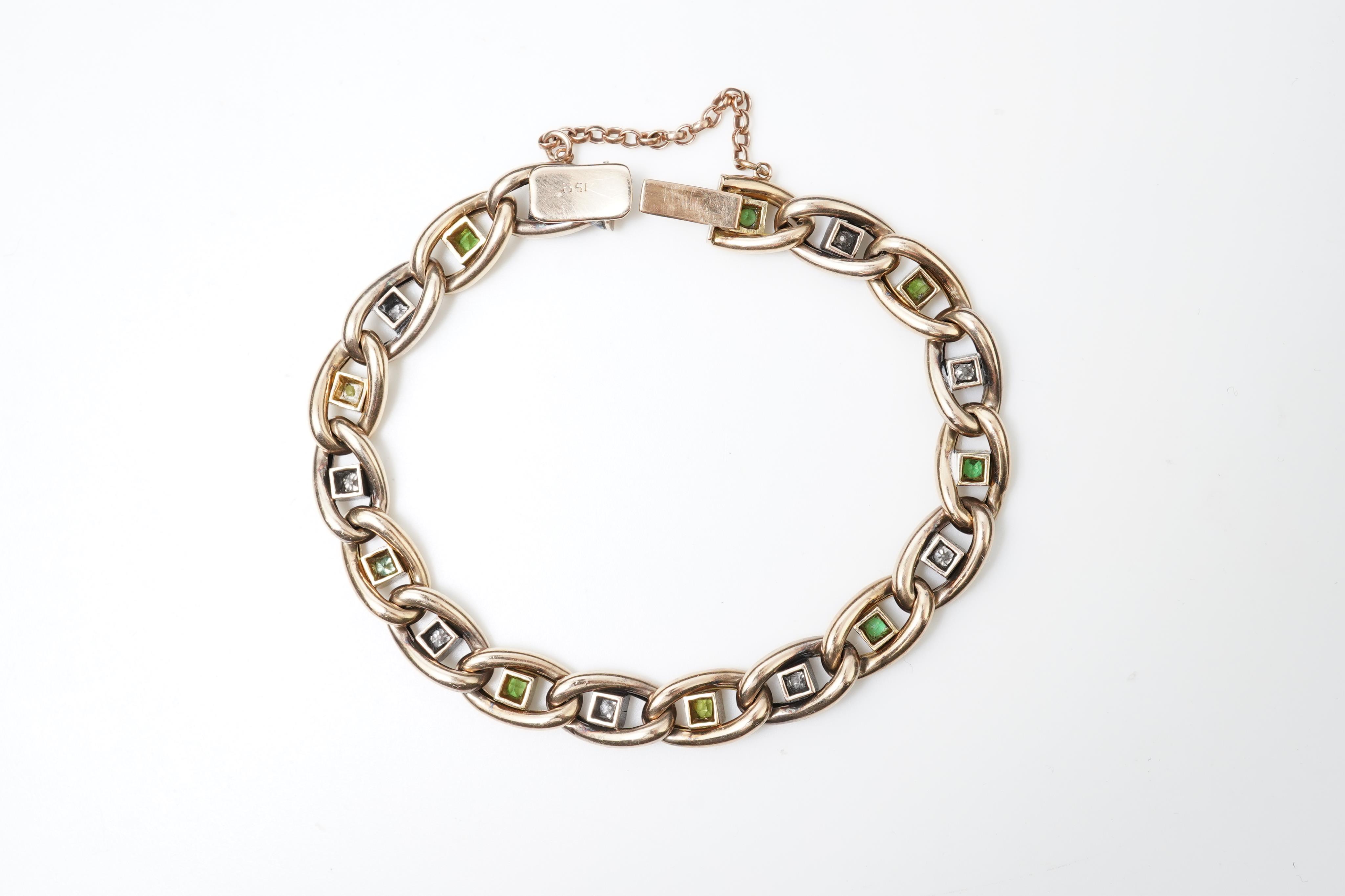 A demantoid garnet and diamond bracelet, early 20th century, composed of curb linking, each link centred on circular-cut diamonds and demantoid garnets in alternation, length approximately 18cm, stamped 15ct