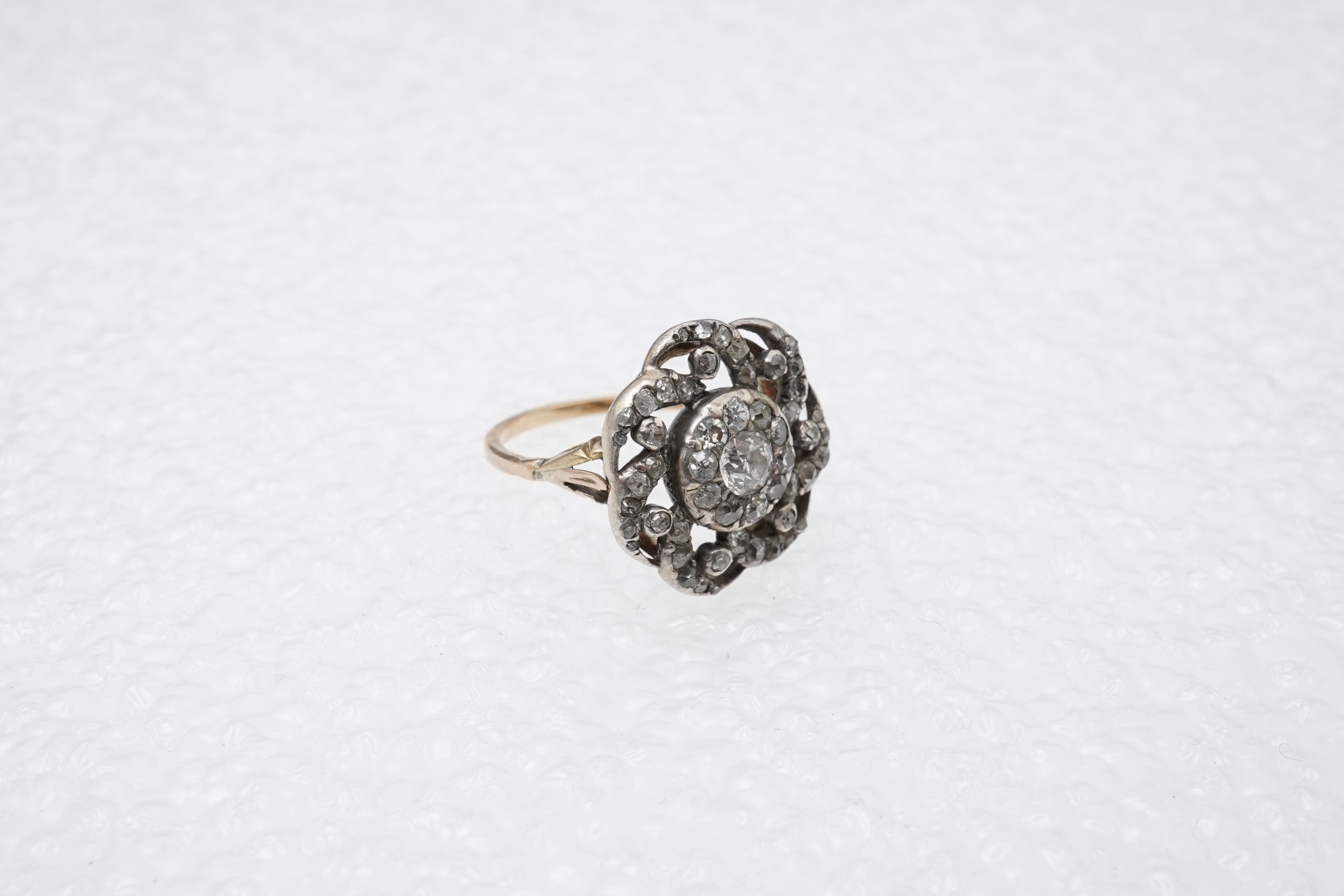 A diamond ring, early 19th century and later, centring on a cluster within a swirled border, set with circular-cut, cushion-shaped and rose-cut diamonds, in closed-back silver settings, to a later gold band, size L