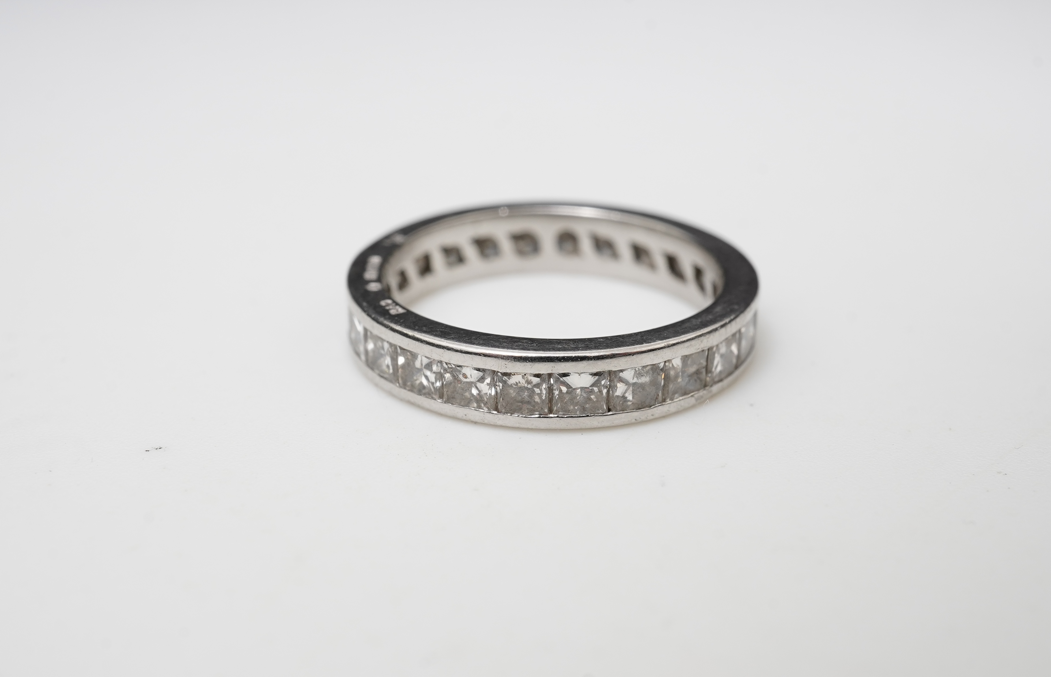 A diamond eternity ring, circa 2000, designed as a continuous band of princess-cut diamonds totalling approximately 2.40 carats, mounted in platinum, size J1/2, British hallmarks