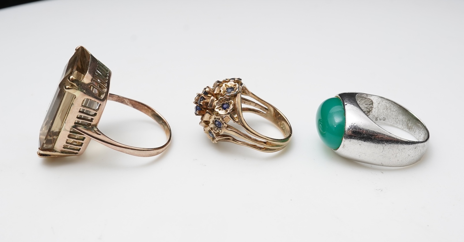 Three gem-set dress rings, comprising: a ring set with a large step-cut citrine, mounted in gold, size N; a floral sapphire ring in 9ct gold, size F, British hallmarks, date letter for 1962, combined gross weight approximately 12 grams; and a green chalcedony ring, size N, French import assay mark for silver