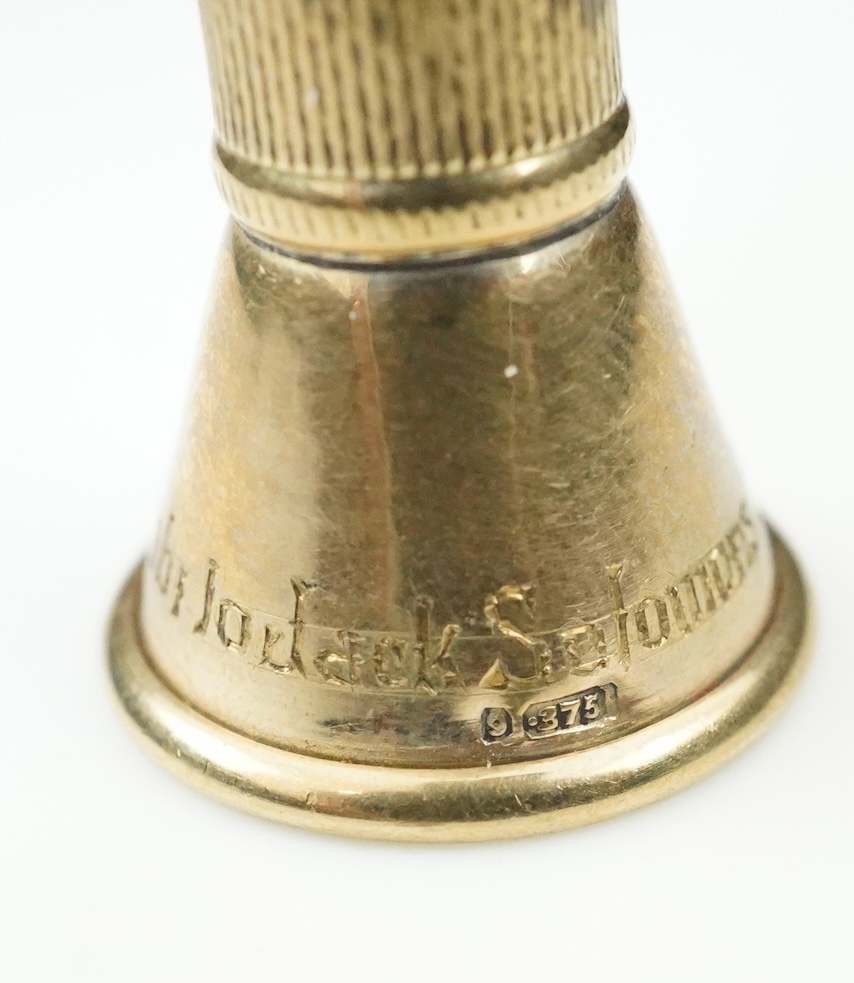A 9ct gold cigar piercer, mid 20th century, of flared design, the piercer operated by pushing the top down, inscribed 'Maccabi Iodack Solomons May 1955 Dublin', length 7.4cm, British hallmarks, gross weight approximately 8.5 grams