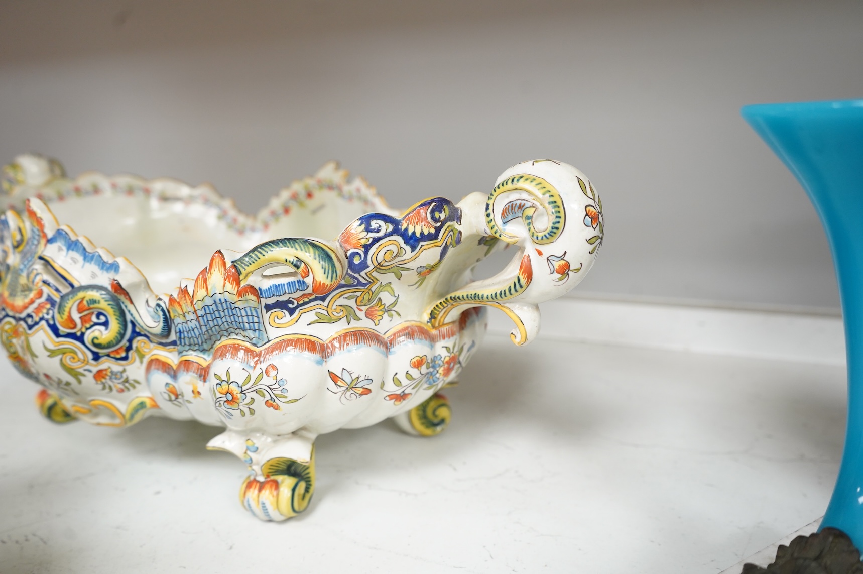 Three French faience planters, one marked Rouen, largest 50cm wide