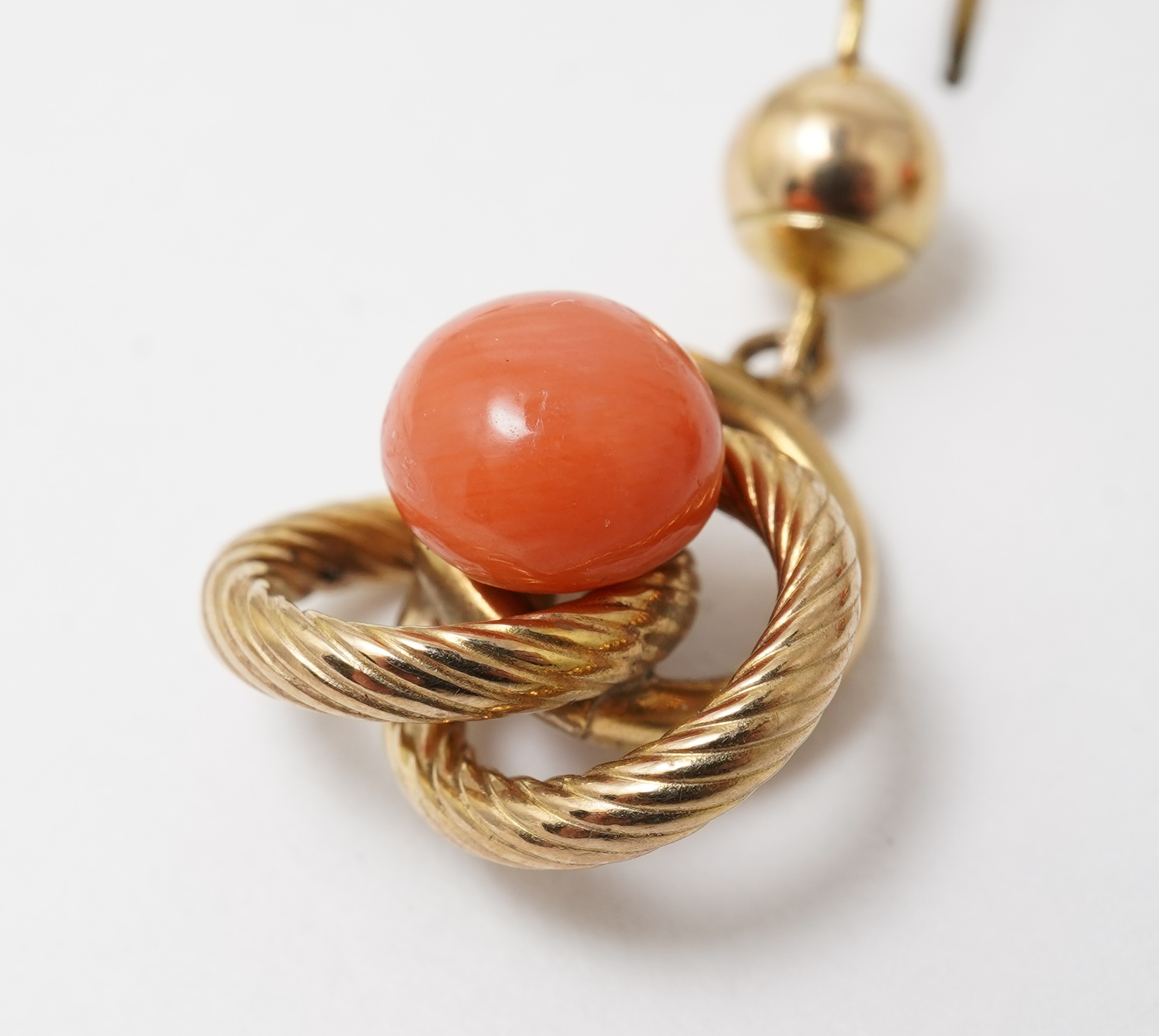 A collection of coral and turquoise jewels, comprising: a coral bead necklace, beads approximately 6-7mm, to a gold spherical clasp, necklace length 102cm, clasp stamped 375, gross weight approximately 61 grams; a pair of earrings of knotted design, set with coral cabochons, length 3.4cm each, hook fittings; and a pair of quatrefoil turquoise and rose-cut diamond earrings, length 1.3cm each, screw fittings, together with a pair of detached pear-shaped cabochon turquoise drops