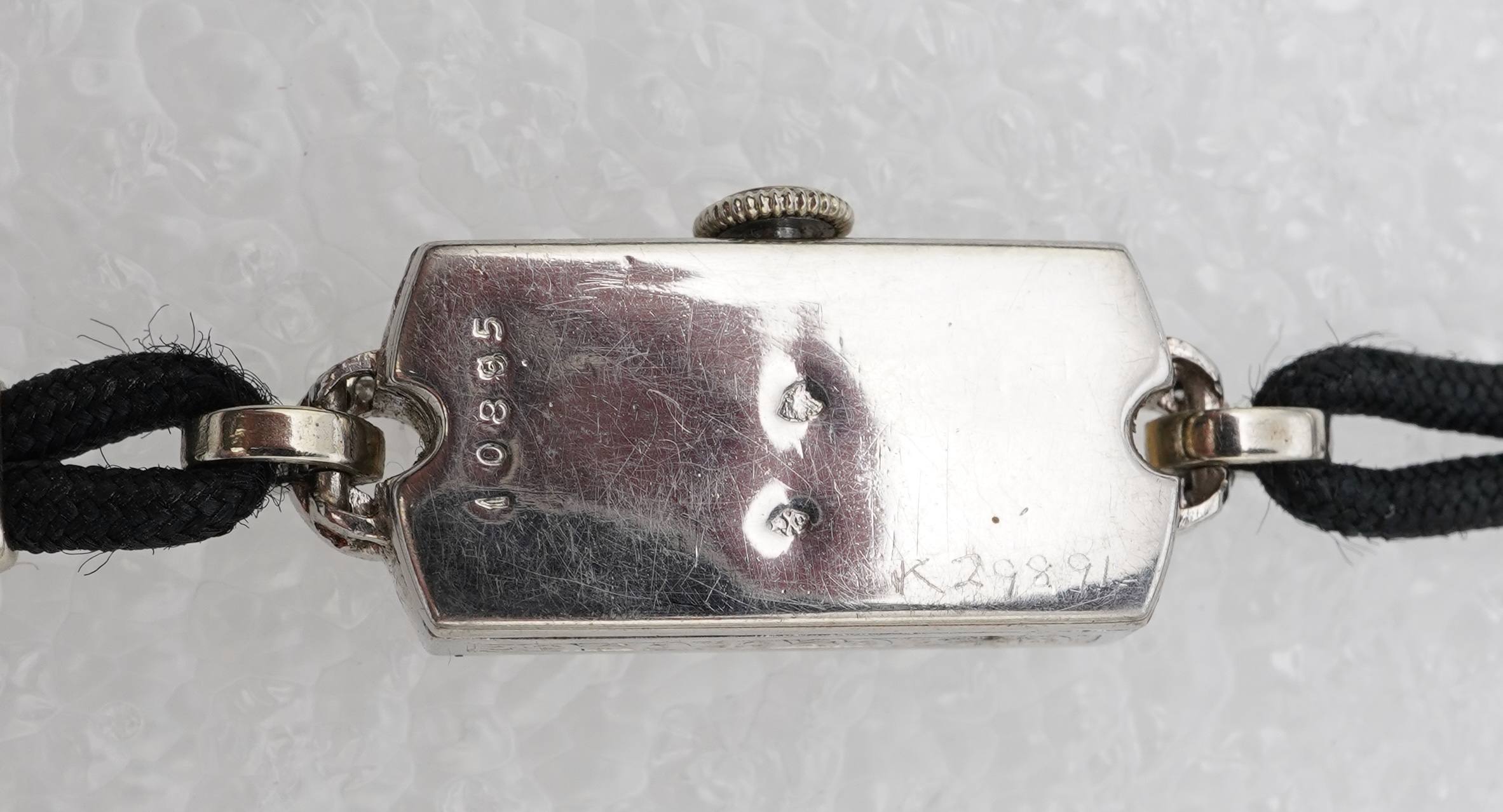An Art Deco onyx and diamond cocktail watch, France, circa 1920, the silvered dial with Arabic numerals and blue steel hands, to a case of geometric design set with circular-cut diamonds and panels of onyx, to a black cord strap, case width 1.1cm, bracelet length 13cm, manual winding movement numbered 35448, case back numbered 10885, case with French assay marks for platinum, and maker's mark GM with crossed hammers, interior with French assay mark for 18ct gold