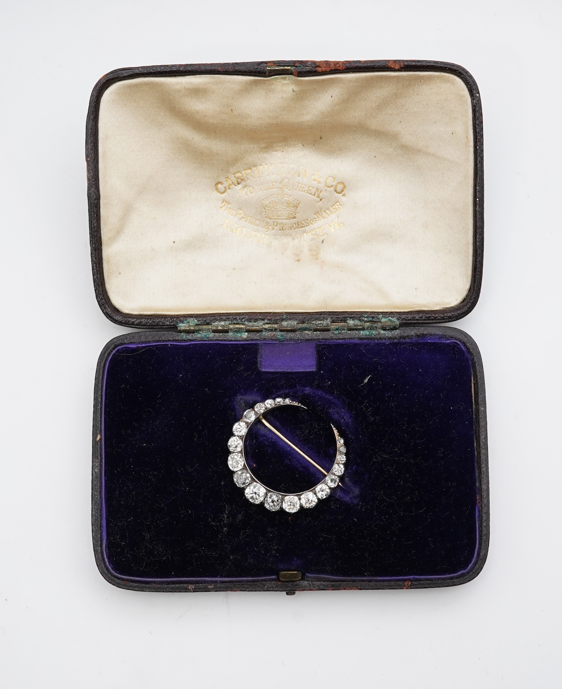 A Victorian diamond brooch, late 19th century designed as a crescent moon, set with cushion-shaped diamonds totalling approximately 2.50 carats, mounted in silver and gold, length approximately 3cm, fitted case stamped Carrington & Co