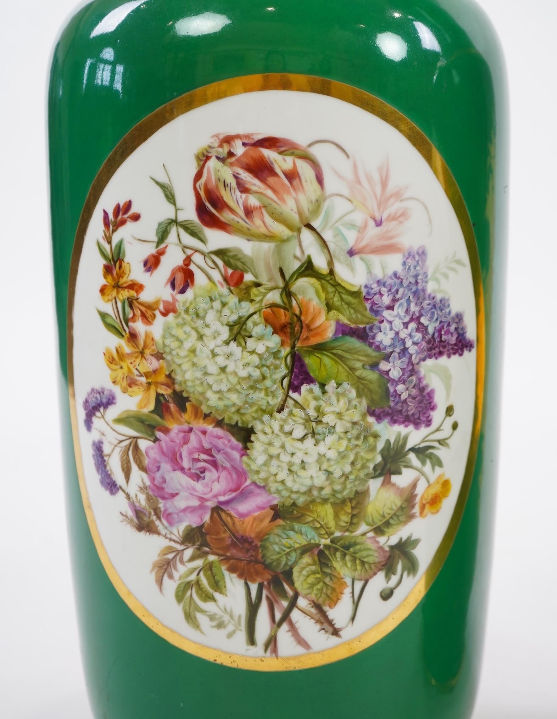 A pair of large Paris porcelain vases, late 19th century, each painted with cherubs floating on a cloud, the reverse with a bouquet of flowers, within a gilt cartouche on an apple-green ground, gilt banded borders, 63.5cm