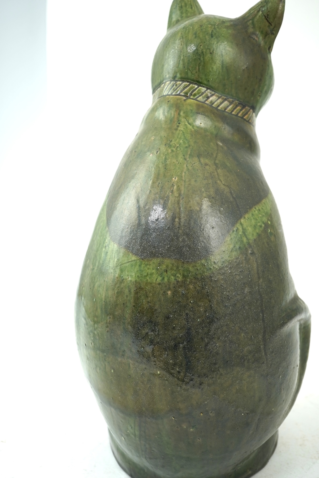 Ewenny Pottery: A large green-glazed figure of a seated cat, incised "Ewenny" and dated 1903 to the underside, 38.8cm high