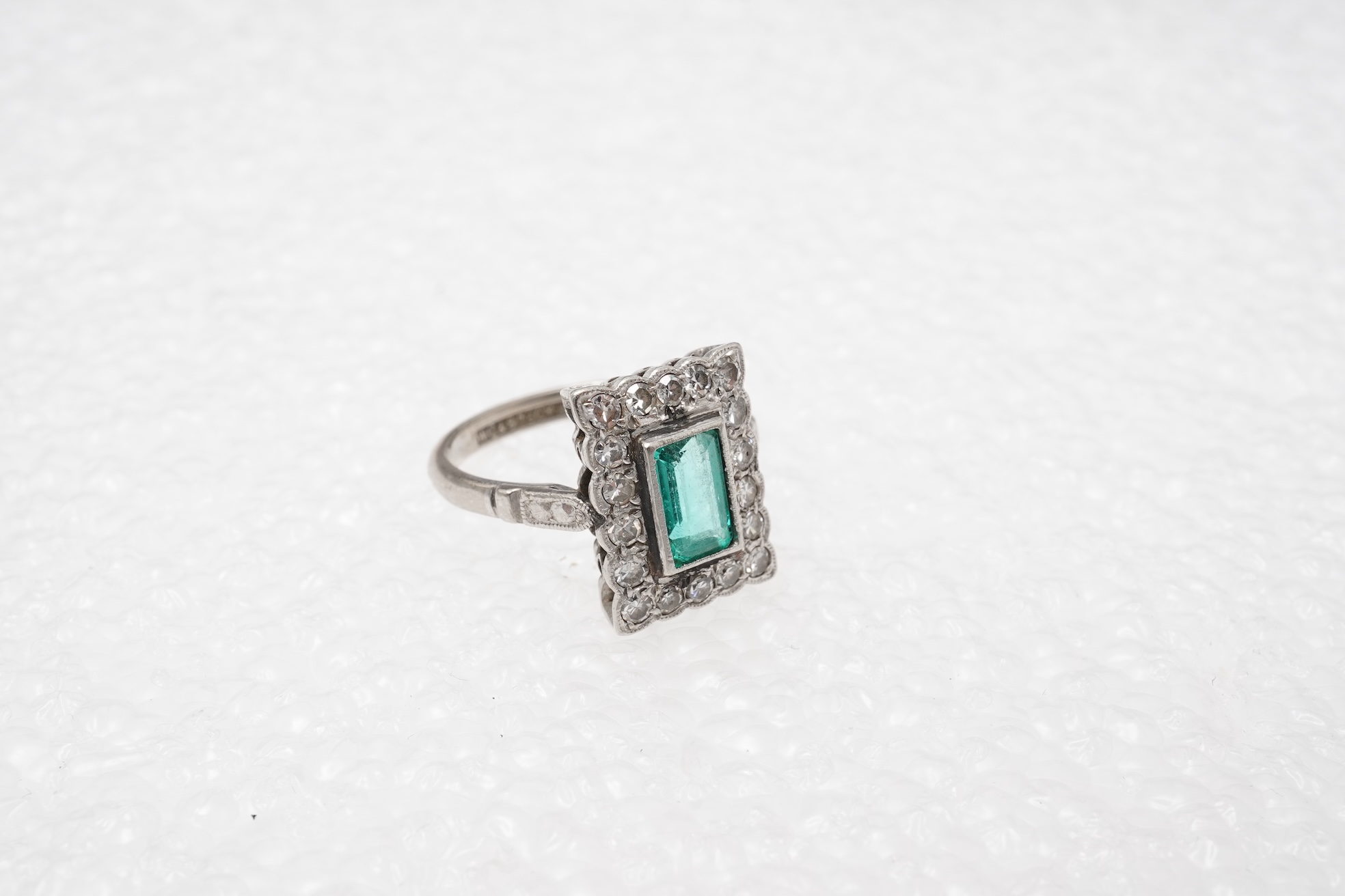 An emerald and diamond cluster ring, first half 20th century, collet-set with a step-cut emerald weighing approximately 0.70 carats, within a border of single-cut diamonds totalling approximately 0.60 carats, mounted in white gold and platinum, size M, stamped WC&S 18CT&PT, gross weight approximately 5 grams