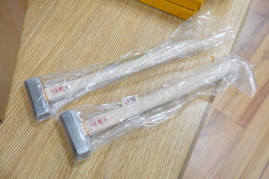 Lot 2308 , A wooden case Japanese 10-piece woodworking chisel set, largest chisel 40mm, together with five heavy duty Japanese hammers/mallets, three examples boxed