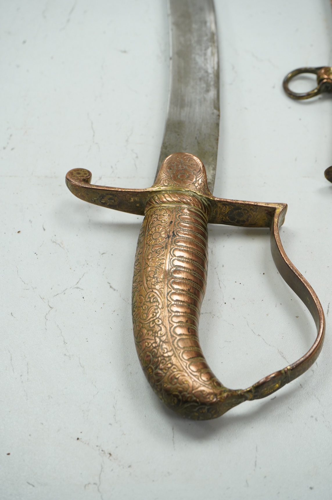 An early 19th century Indian sabre with curved single edge blade, copper grip and stirrup hilt, in its copper scabbard embossed with lions, scrolling foliage and flowers