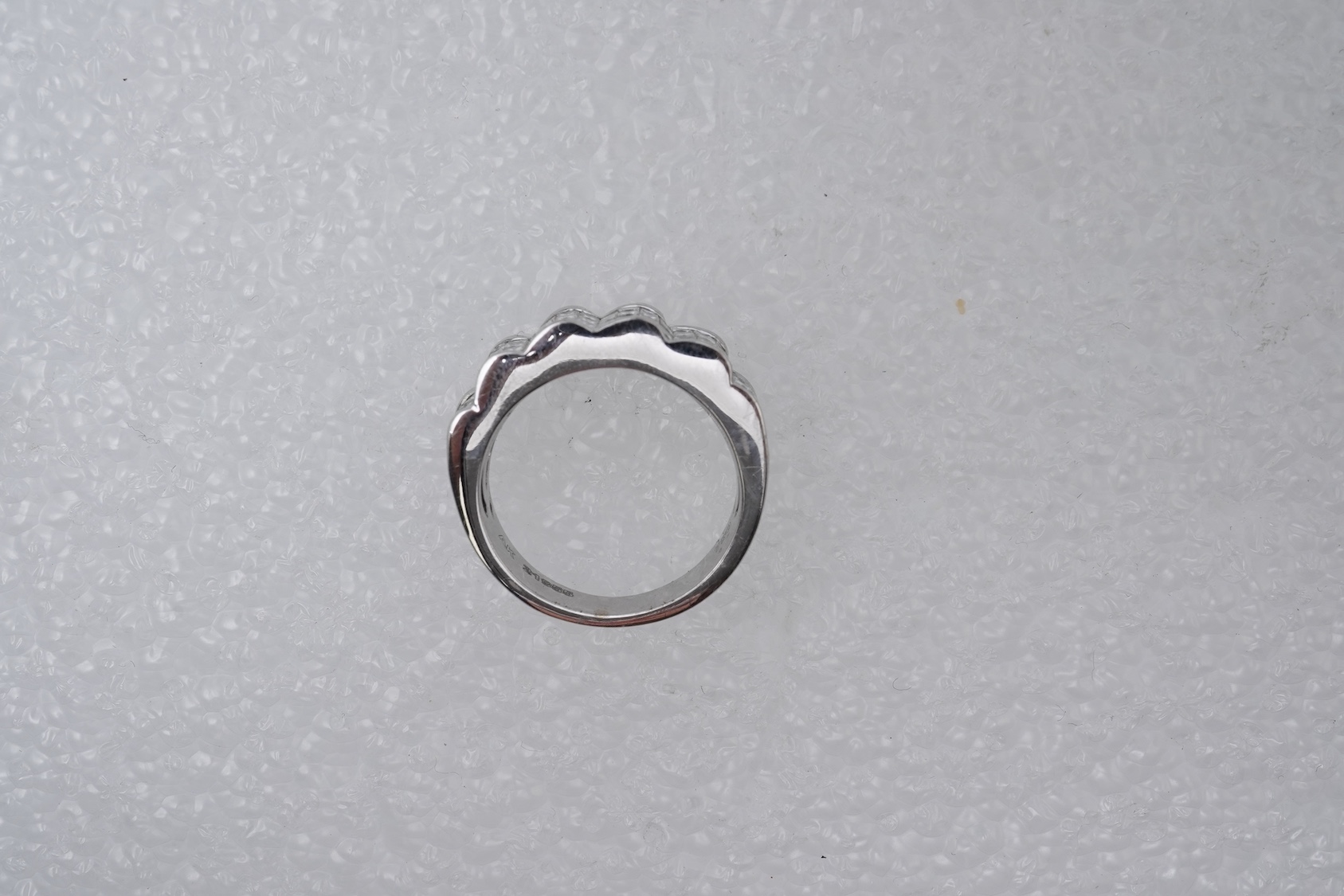 A diamond dress ring, the front of undulating design, invisibly set with princess-cut diamonds totalling approximately 2.00 carats, mounted in white gold, size O, stamped 750, maker's mark AK, numbered 21955, gross weight approximately 8 grams