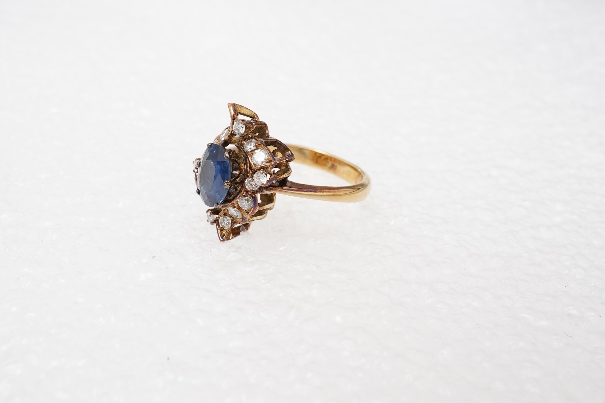 A sapphire and diamond cluster ring, claw-set with an oval sapphire weighing approximately 1.00 carat, within a foliate gold mount set with brilliant-cut diamonds totalling approximately 0.70 carats, mounted in gold, size P1/2