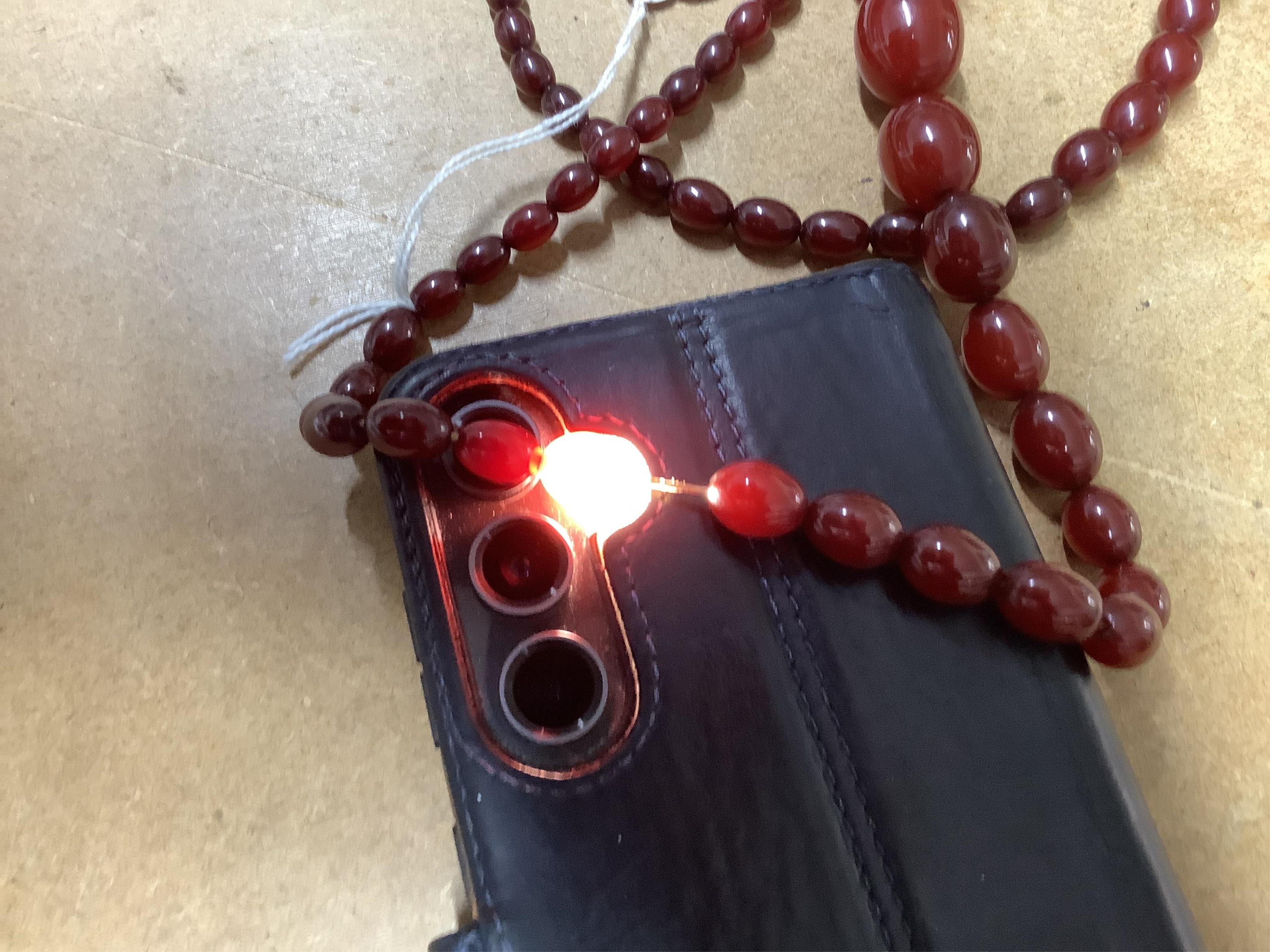 A cherry-coloured bakelite simulant amber necklace, composed of graduated beads measuring approximately 8-28mm, length 86cm, gross weight approximately 61 grams