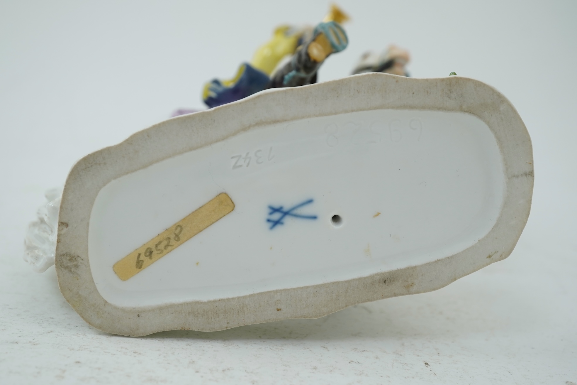 A Meissen group of a bugler on horseback, early 20th century, modelled on a flower encrusted base, underglaze blue crossed swords mark and impressed model number 69528, 17cm high