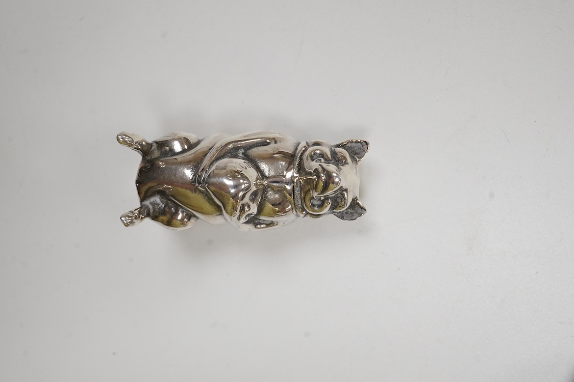 Lot 2830 , A George V silver mounted fan pin cushion, Henry Matthews, Birmingham, 1912, width 62mm, together with an Edwardian silver vesta case and a white metal pig vesta case.