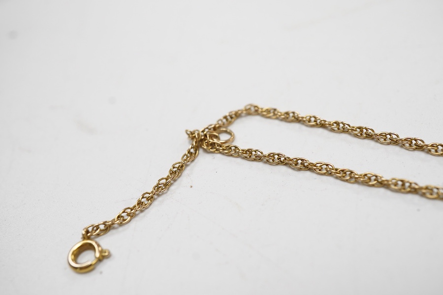 A collection 9ct brooches to include a shell cameo carved with the Three Graces, an amethyst set floral spray brooch, a cultured pearl set ribbon brooch, a garnet set bar brooch and a cultured pearl set stick pin, together with a 9ct chain, 51cm.