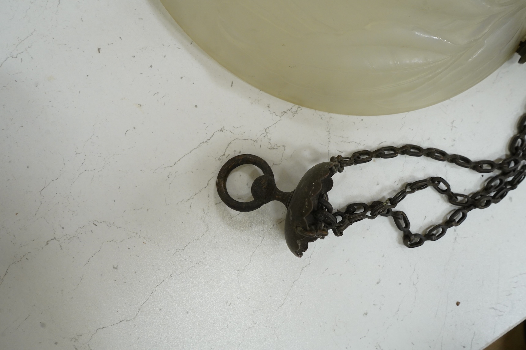 A Lalique style opalescent glass ceiling shade decorated with three sunflowers, 34cm in diameter