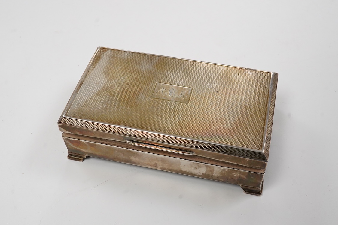 An Elizabeth II engine turned silver and yellow metal square compact, by Mappin & Webb, Birmingham, 1953, 69mm, together with a George V silver concave card case, Birmingham, 1911.