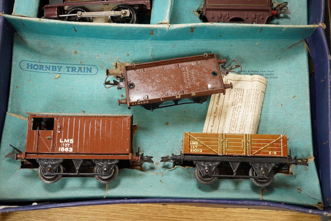 Two Hornby 0 gauge tinplate clockwork train sets; a No.601 LMS Goods Set with 0-4-0 tender locomotive, 5600, in maroon livery, etc., together with a No.501 LNER passenger set with 0-4-0 tender locomotive, 1842, in green livery, three 4-wheel teak coaches, etc., boxes af