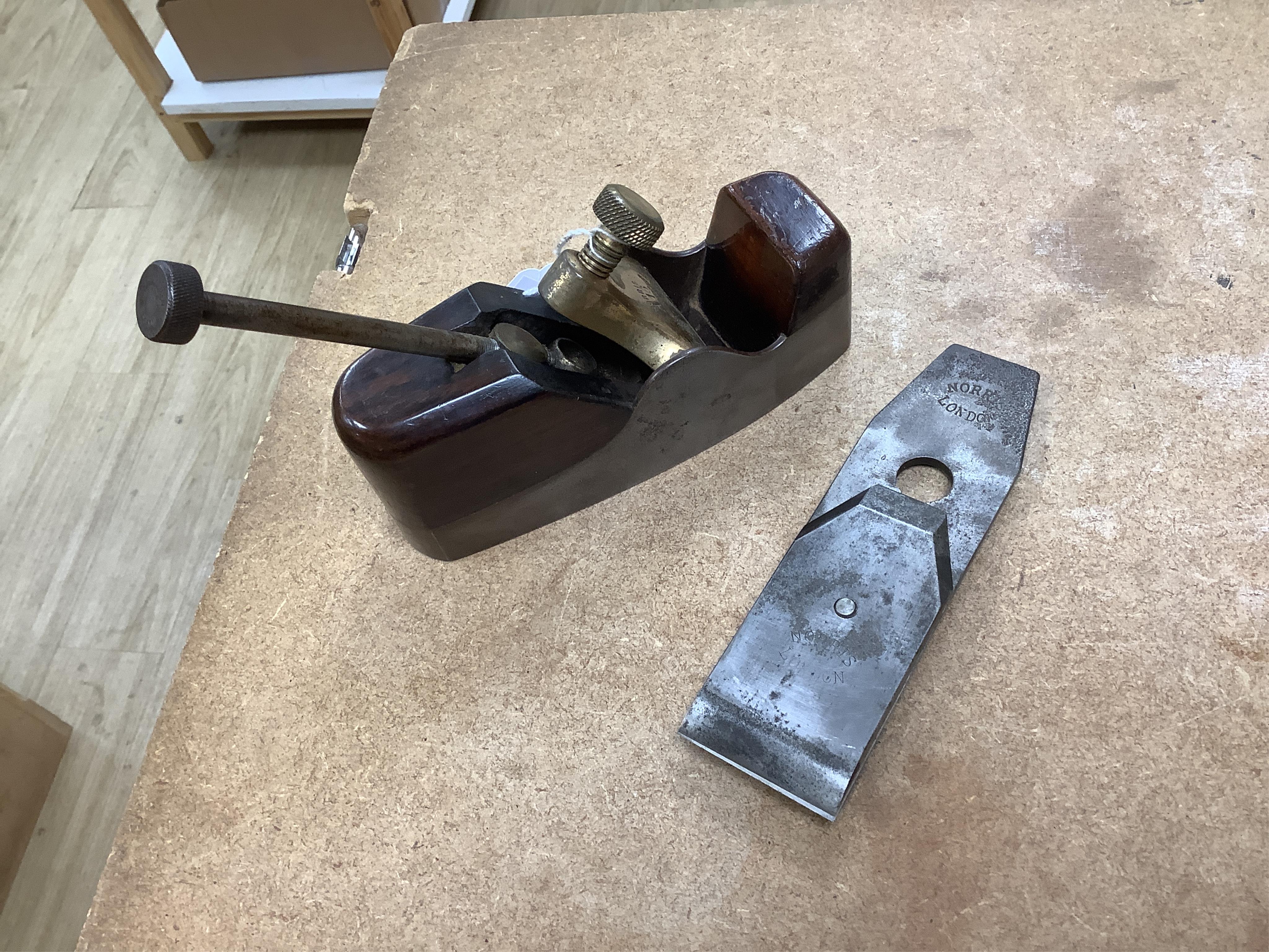 A Norris A16 adjustable steel soled smoothing plane, stamped with Norris, London to both the brass lever cap and the iron, and ‘annealed’ stamped to the front