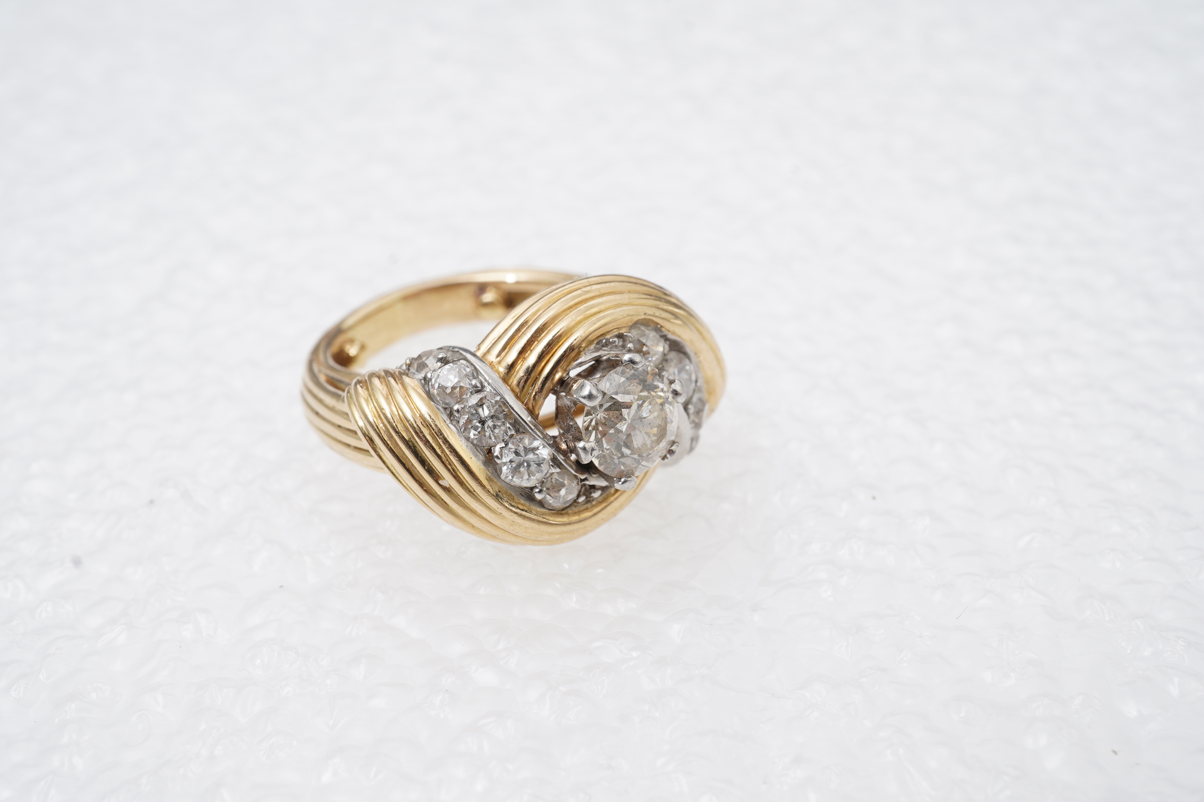 A gold and diamond cocktail ring, France, mid 20th century, claw-set with a circular-cut diamond weighing approximately 0.80 carats, to a sinuous mount of fluted design set with smaller circular-cut diamonds totalling approximately 0.50 carats, mounted in gold and platinum, size I1/2 (sizing beads), French assay marks for 18ct gold and platinum, partial French maker's marks, gross weight approximately 11 grams, case stamped Goldsmiths & Silversmiths Company