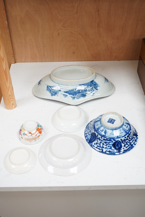 A small bowl decorated with figures and a blue and white bowl decorated with pagodas both have hairline cracks. The other pieces are in generally good condition, minor general wear