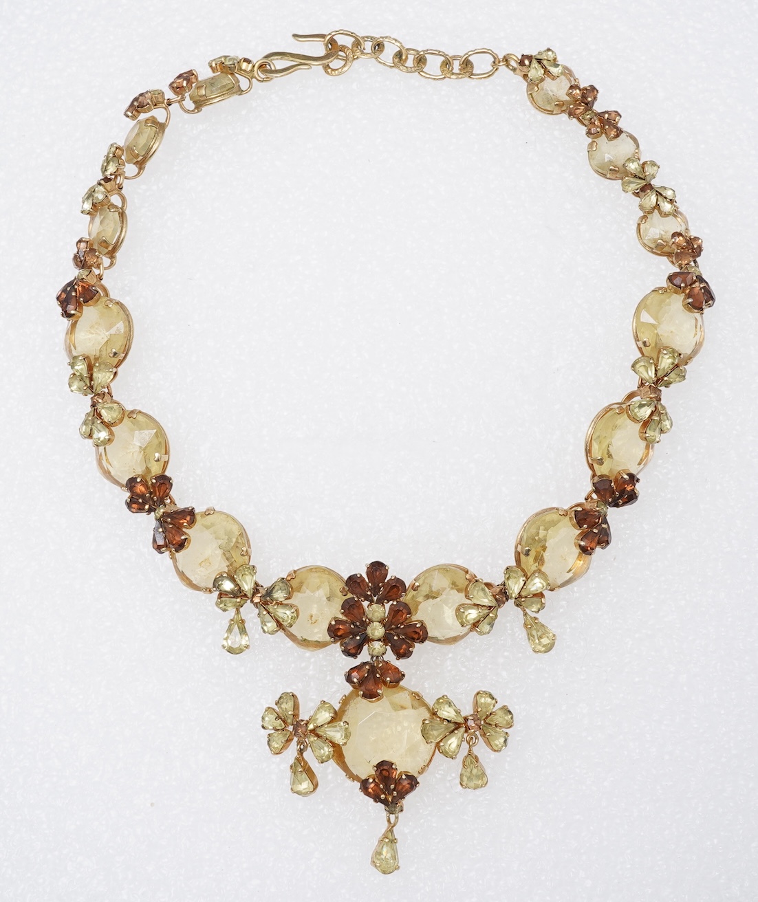 Christian Dior, a collection of paste jewels, comprising: a floral necklace suspending a pendant, length 40cm, adjustable, signed Christian Dior; and two brooches designed as a floral plaque and a crescent moon respectively, longest 7.1cm, each signed Chr.Dior, each set with pastes simulating citrines and diamonds, mounted in gilt metal