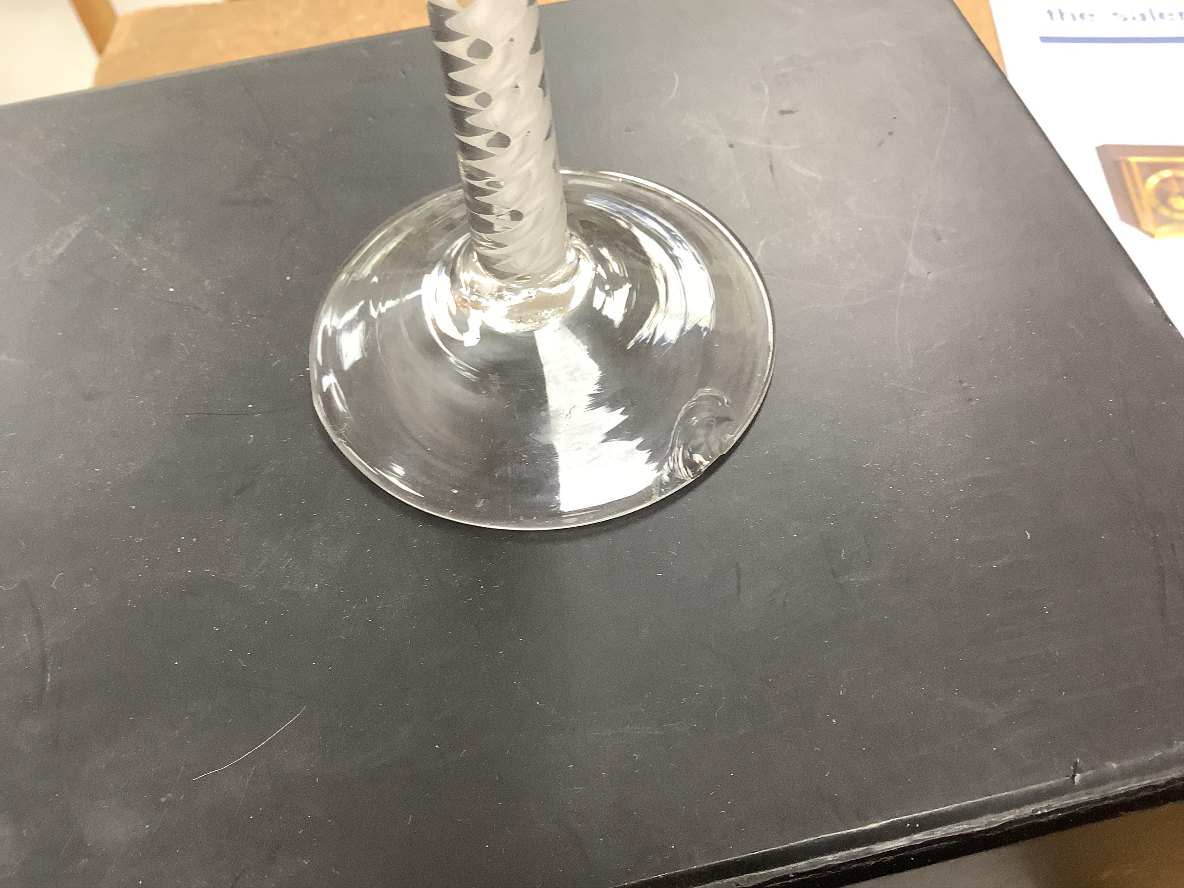 Taller glass has Jacobite sympathies with a rose and single bud, images 8 and 9. Taller glass good despite lead inclusion to foot, image 10 Smaller glass foot chipped, clearly visible, 7th image.