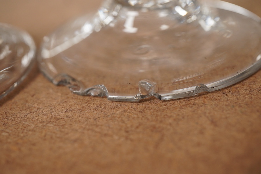 Three 18th century trumpet glasses, two with air twist stems (one with folded foot), together with another with a knopped stem and tear, tallest 16.5cm high