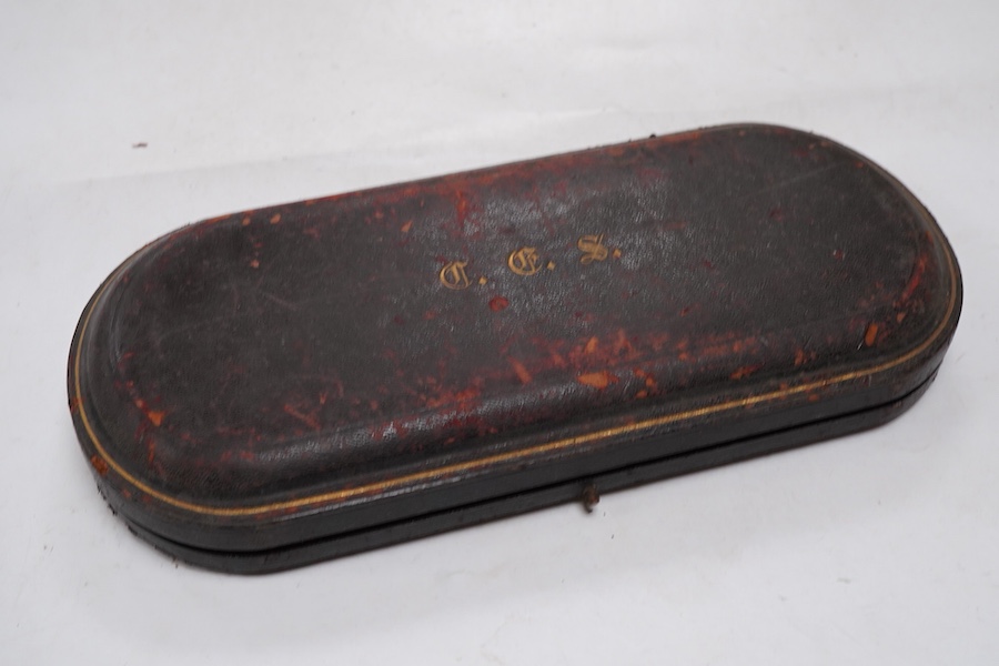 A cased pair of late Victorian silver salad servers, with apostle finials, maker's mark rubbed, London, 1896, 23.1cm, 5.8oz.