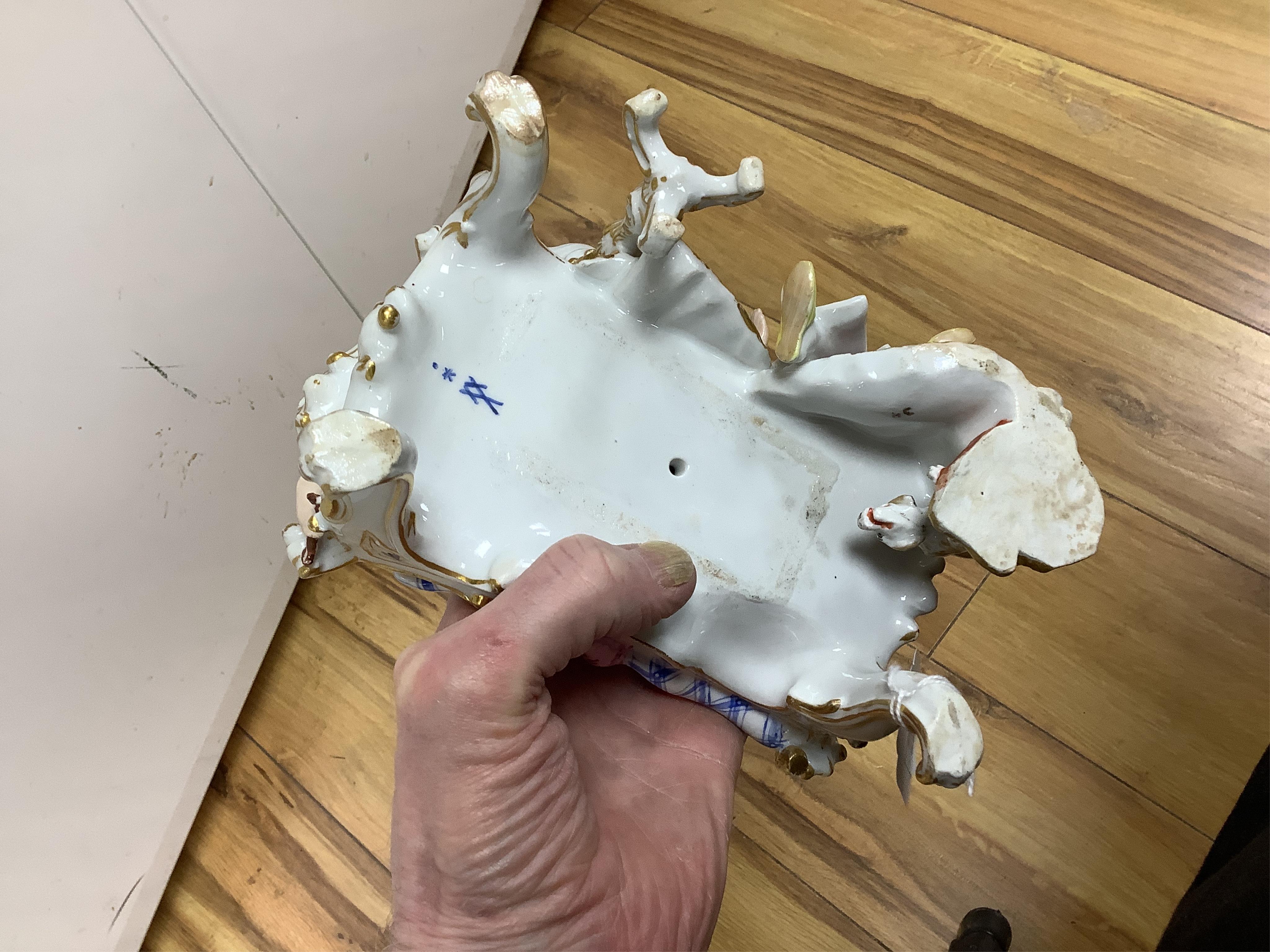 Female’s head glue re-attached, clearly visible; otherwise good including gilding. Apocryphal Marcolini Meissen mark in blue enamel, but later.